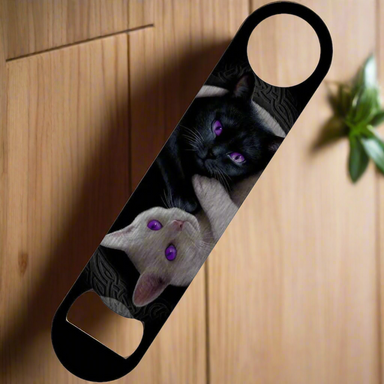 Spice up your bar accessories with this stylish and functional bar blade bottle opener featuring the iconic Yin Yang and Muther Fluffer cat designs...