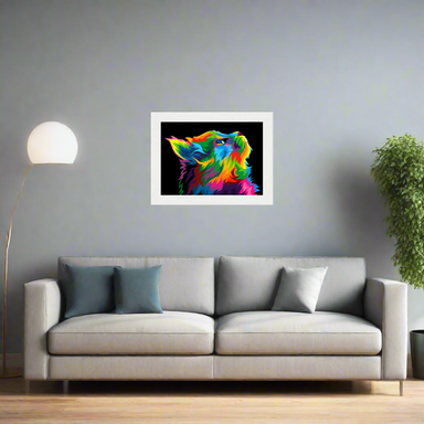 Bourbon Black Cat - Framed Picture Featuring an illustration of a cute fluffy black kitten with curled up tail standing on the beautiful light brow...