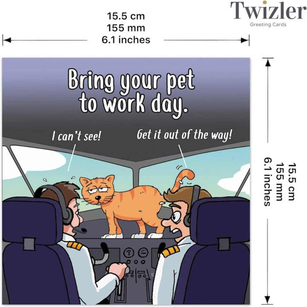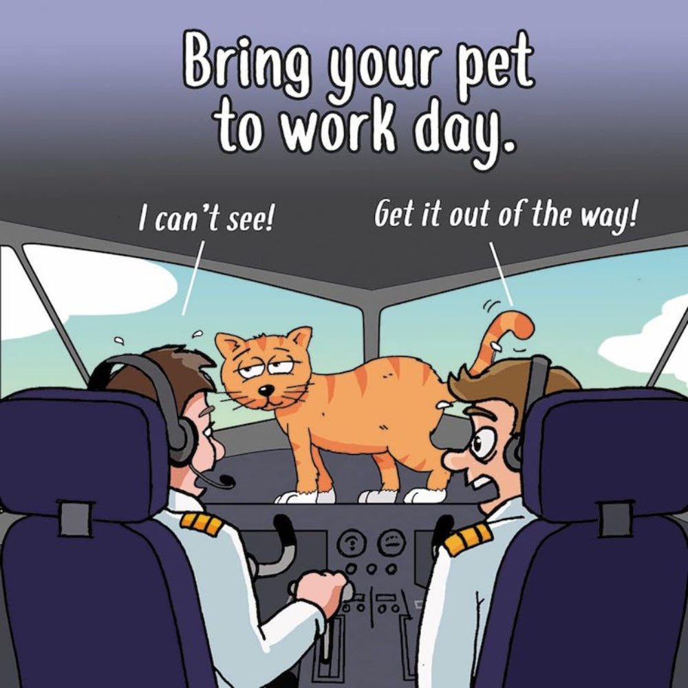 This humour cat card features a pilot who really should have thought the whole bring the pet to work thing through!