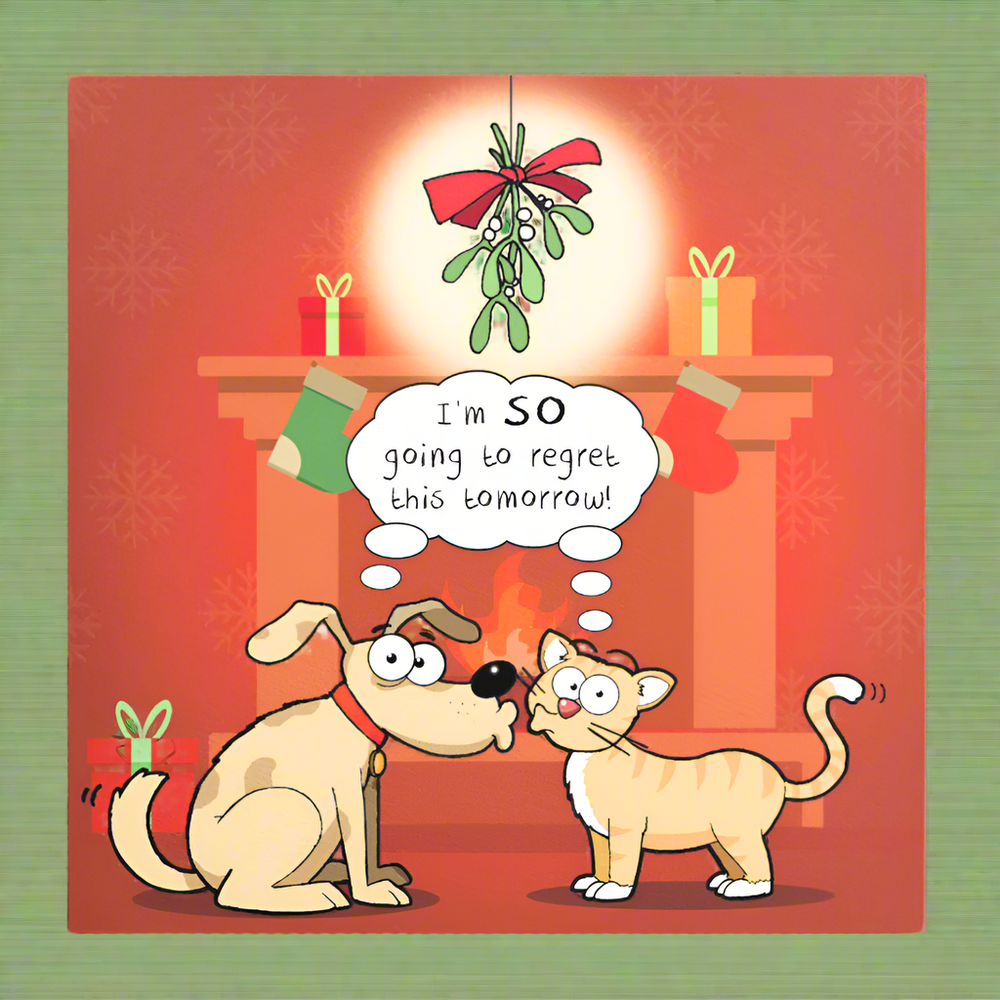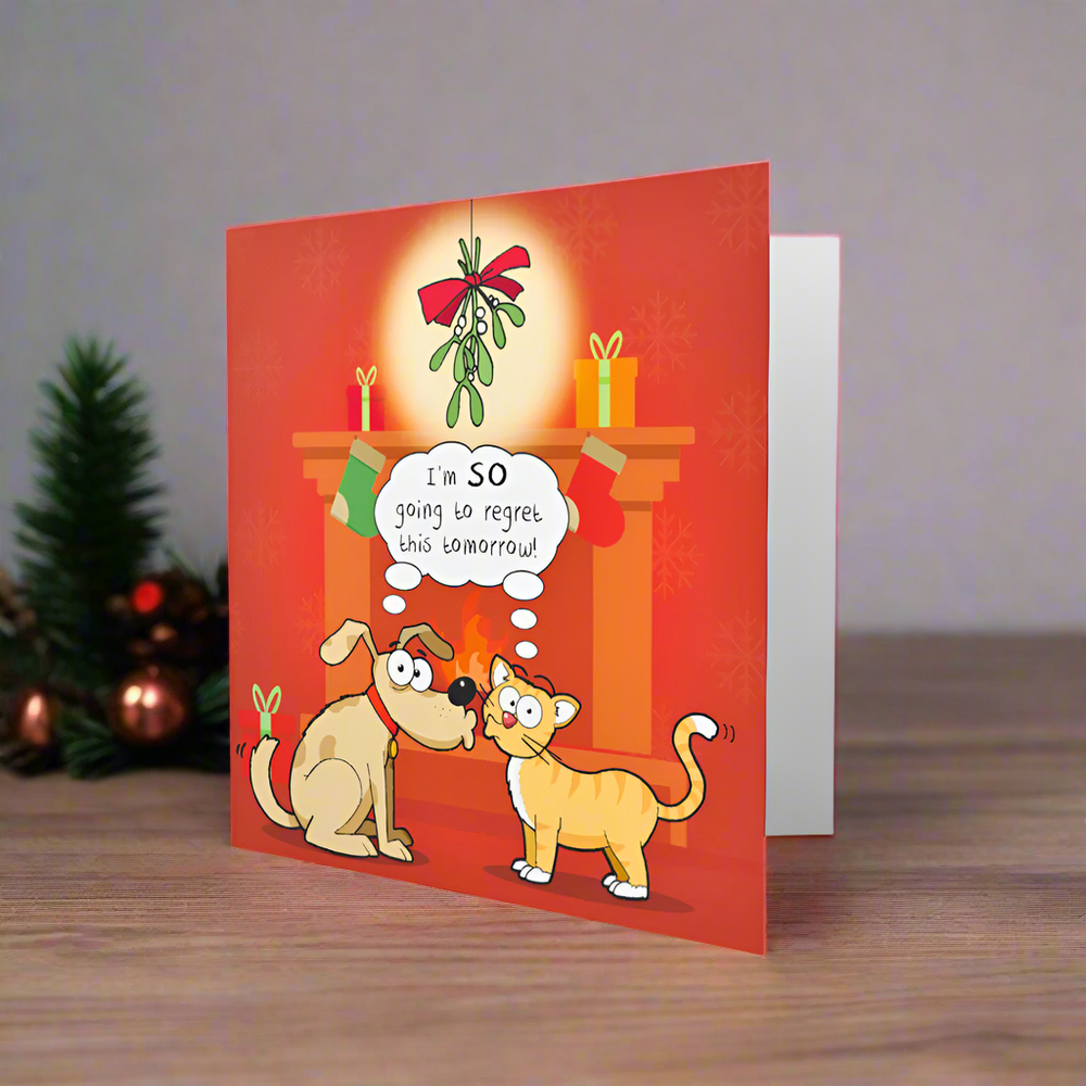 A brilliant and hilarious Christmas card, featuring a dog and a cat puckering up underneath the mistletoe! Both share the speech bubble saying Im so going to regret this tomorrow! Purrfect for the cat or dog lover in your life!