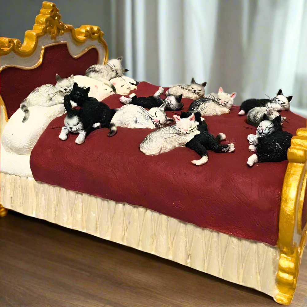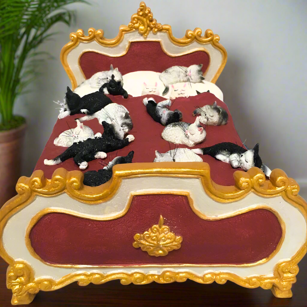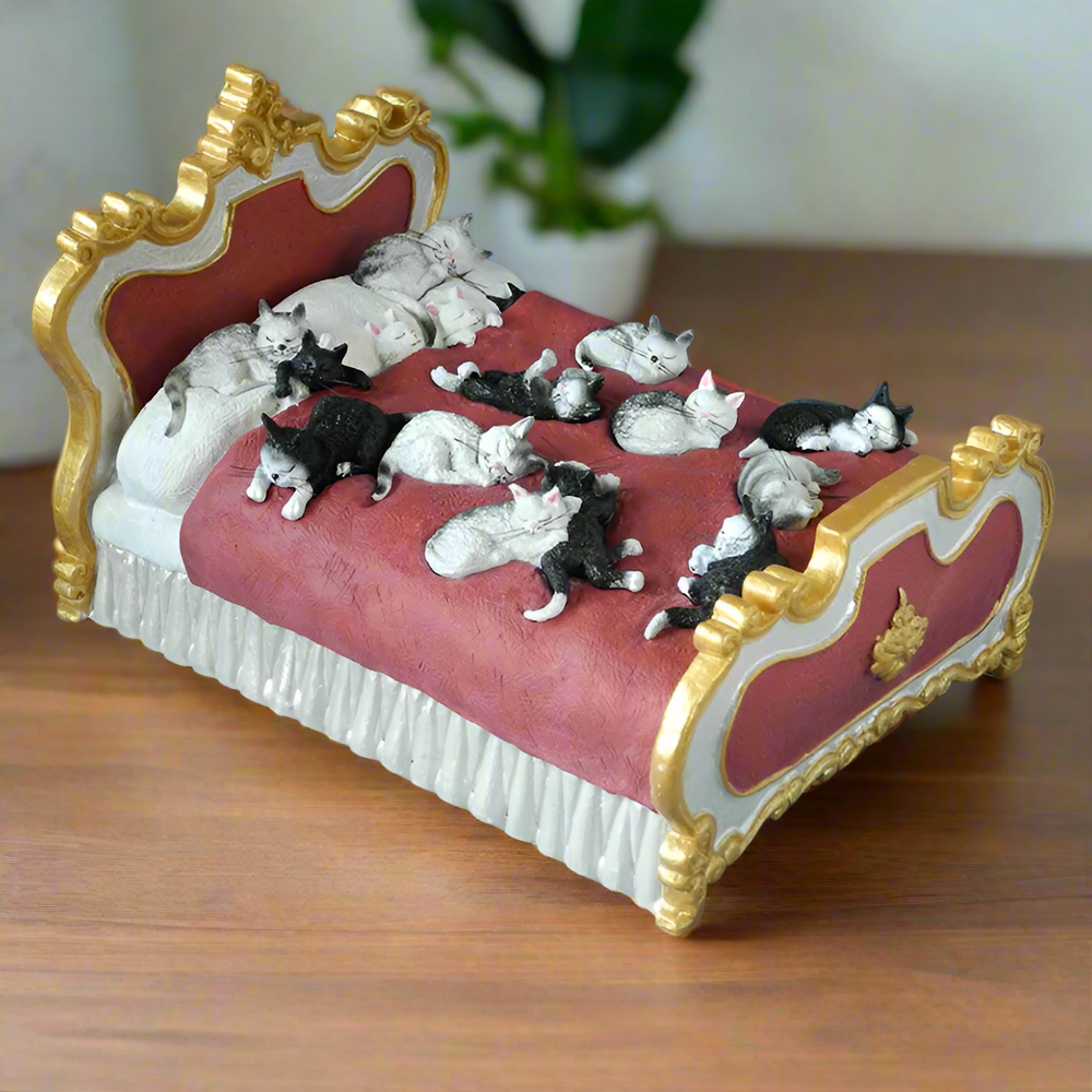 This Dubout Cats Cat Figurine is a must-have for cat lovers and collectors alike. The piece features lots of cats sleeping on a bed, and you can test your counting skills as you try to determine how many feline friends are present. The ornament is made of synthetic resin and measures 13cm in height, 21.3cm in width, and 15.5cm in depth.