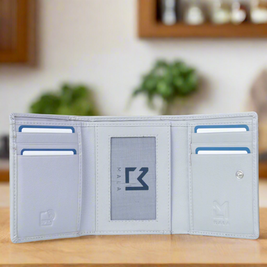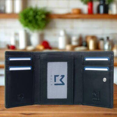 Compact and lightweight, this gorgeous leather tri fold purse has three mischievous black cats peeking over a wall. Inside the tri-fold section th...