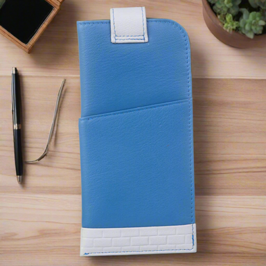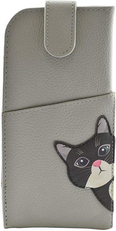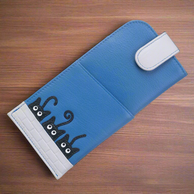 Soft leather glasses case with 3 appliqued cats peeking over a wall. Holds most sizes of glasses and has an expandable gusset on the one side. The...