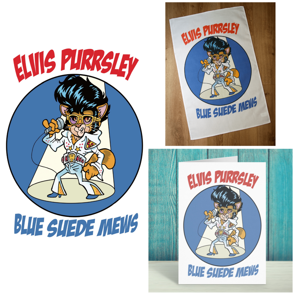 - Design: “Elvis Purrsley – Blue Suede Mews” with cartoon cat in iconic jumpsuit