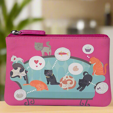 Mala Leather Zip Top Small Coin Purse Style Cats on the Sofa on Front of Purse 100% Leather Holds Bank Cards Size when closed 12cm x 8cm x 1cm