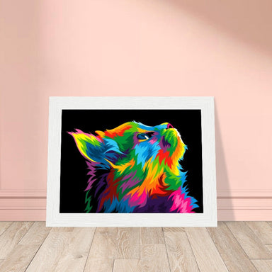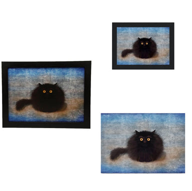 Bourbon Black Cat - Framed Picture Featuring an illustration of a cute fluffy black kitten with curled up tail standing on the beautiful light brow...