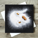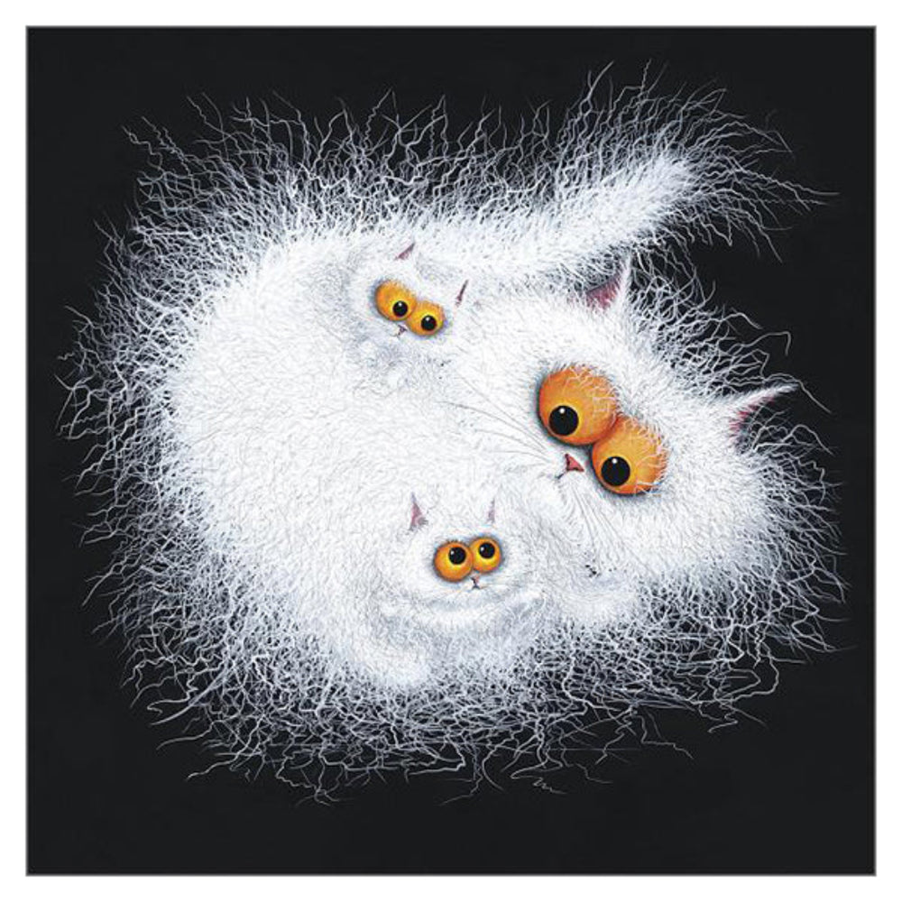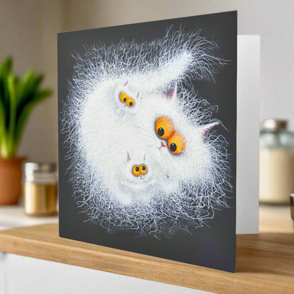 A charming and whimsical illustration by Tamsin Lord, "Furballs" captures the delightful chaos of fluffy feline companionship. With electrified white fur and striking amber eyes, this adorable trio of cats appears to be a bundle of mischievous energy. Set against a deep black background, their expressive faces and fuzzy textures create a striking contrast, making this card a perfect choice for cat lovers and art enthusiasts alike.