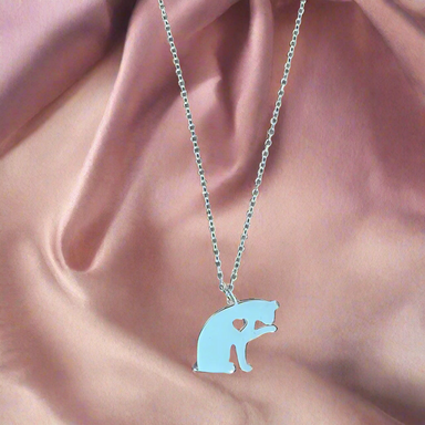 Adorn yourself with sophistication and charm with our Elegant Cat with Heart Licking Paw Silver Necklace. Made of 925 Sterling Silver and hallmarke...