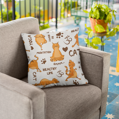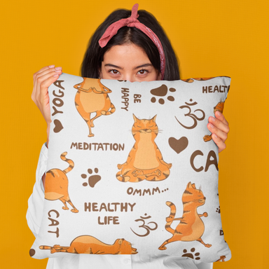 Our Yoga Cat design cushions feature a cute cat doing a range of yoga poses. Do Yoga and Be Happy >^..^< One in Ginger and one Multi coloured...