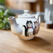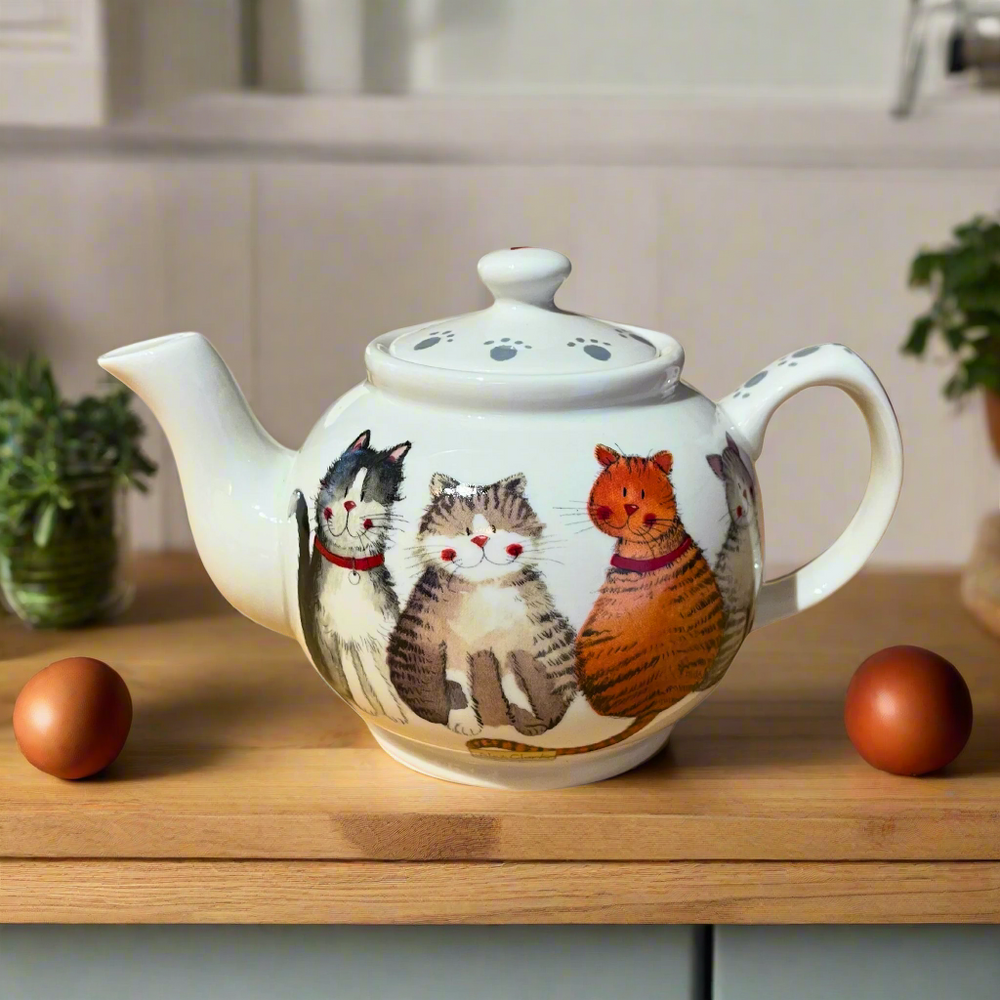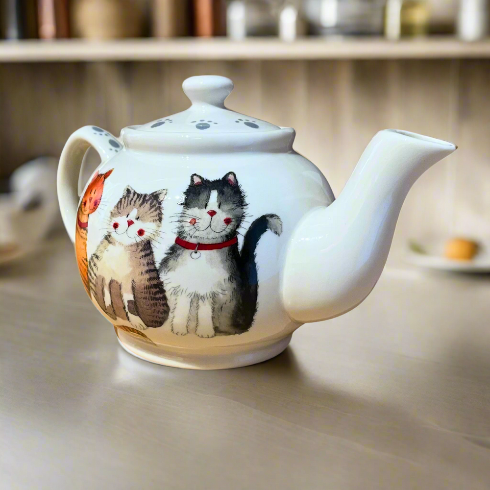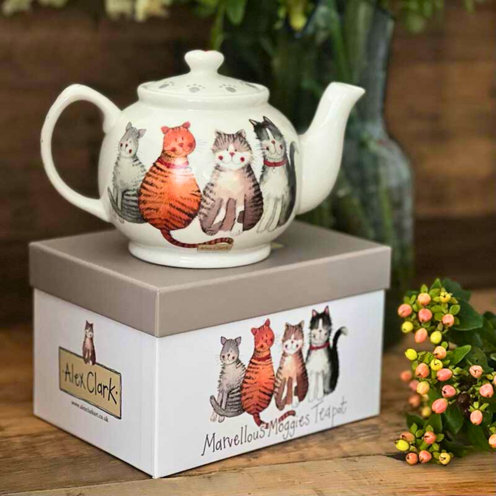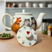 Brew your morning cup of tea with our lovely ceramic teapot. This teapot features the Marvellous Moggies artwork with paw prints around the handle and a little red heart on the top of the lid.