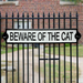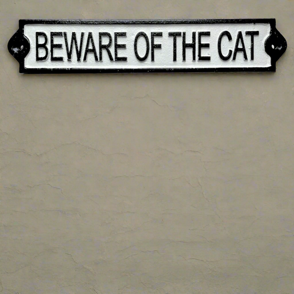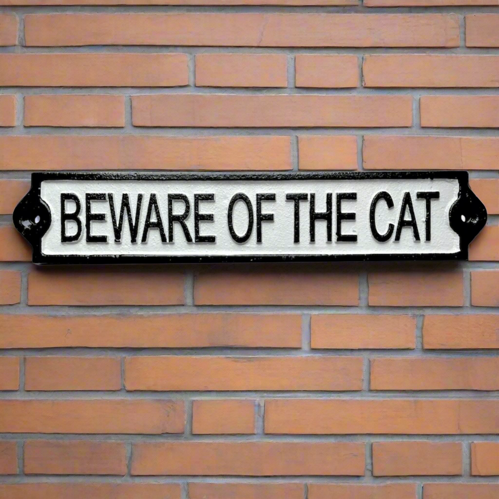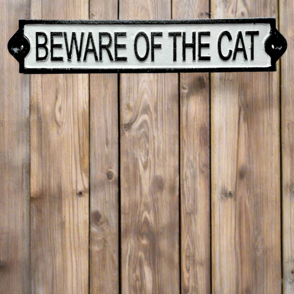 Add a touch of vintage charm to your garden with this 3D cast iron hanging sign from Fallen Fruits. Featuring the words "BEWARE OF THE CAT" in black and white, this rectangular sign with dimensions of 25.5 cm x 5 cm x 1 cm is purrfect for any cat lover. Made of durable cast iron.