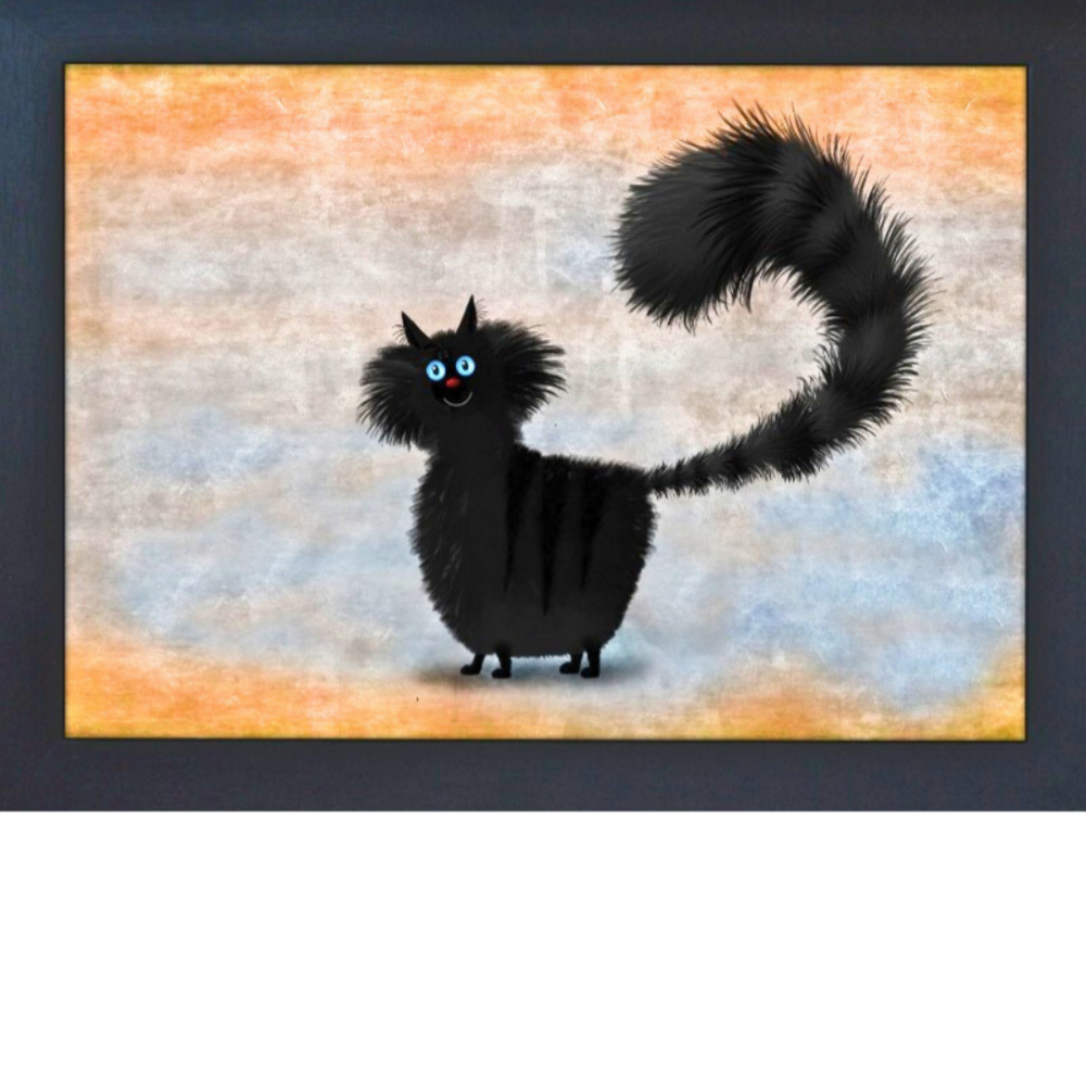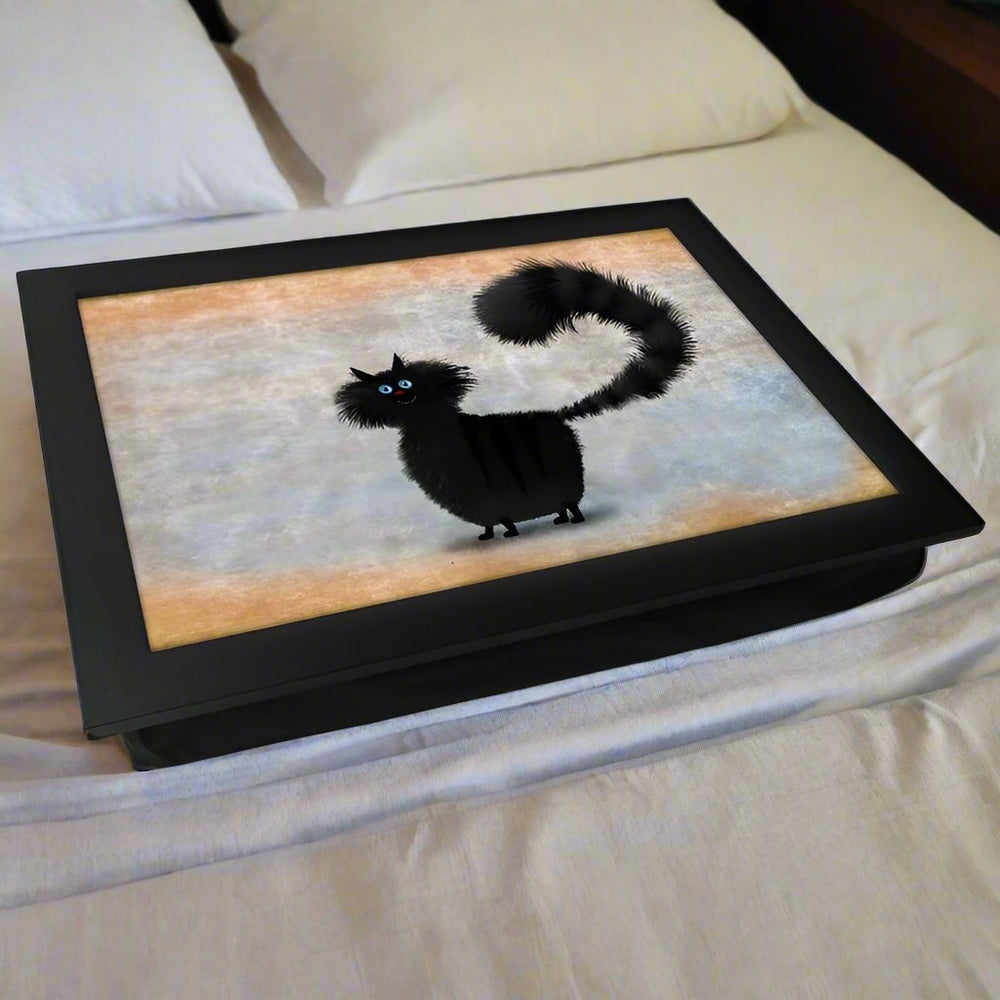 Exclusively designed by Fabulous Felines® Our Bourbon Cat lap tray design features a cute fluffy black kitten with a curled up tail standing on the beautiful light brown background.