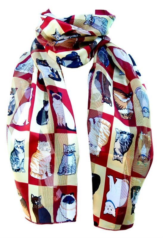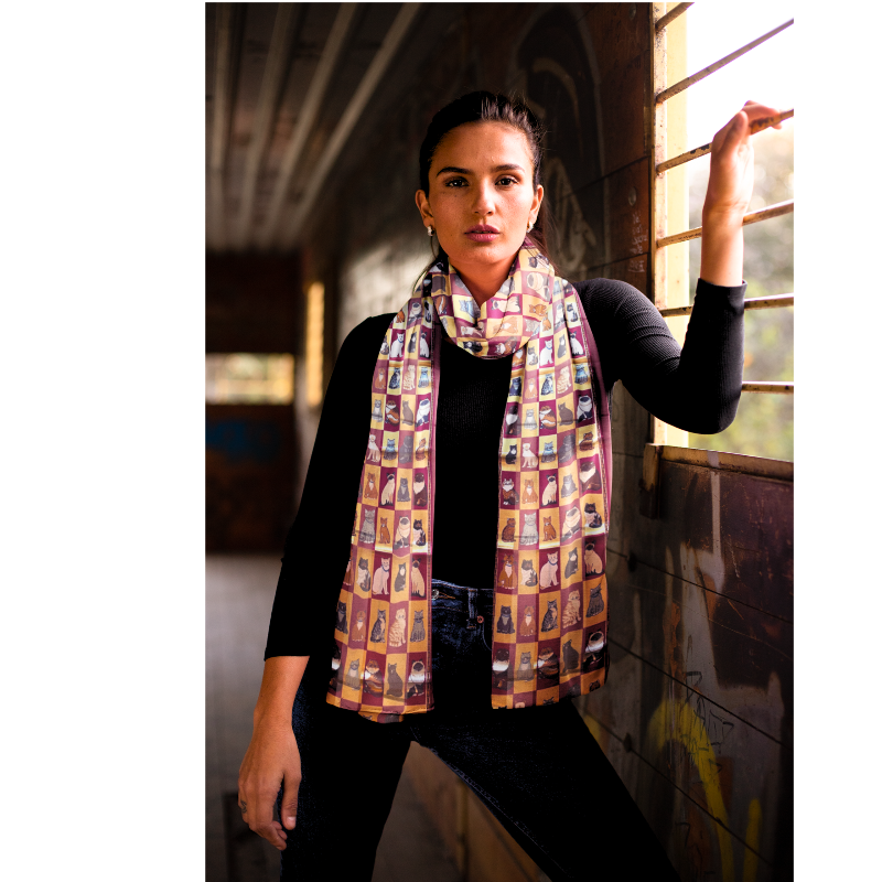 This scarf is the purrfect addition to any cat lover's wardrobe. With a charming pattern featuring cats in boxes, it's sure to bring a smile to your face. The scarf is made from a soft and lightweight chiffon feel polyester material, making it comfortable to wear all year round.