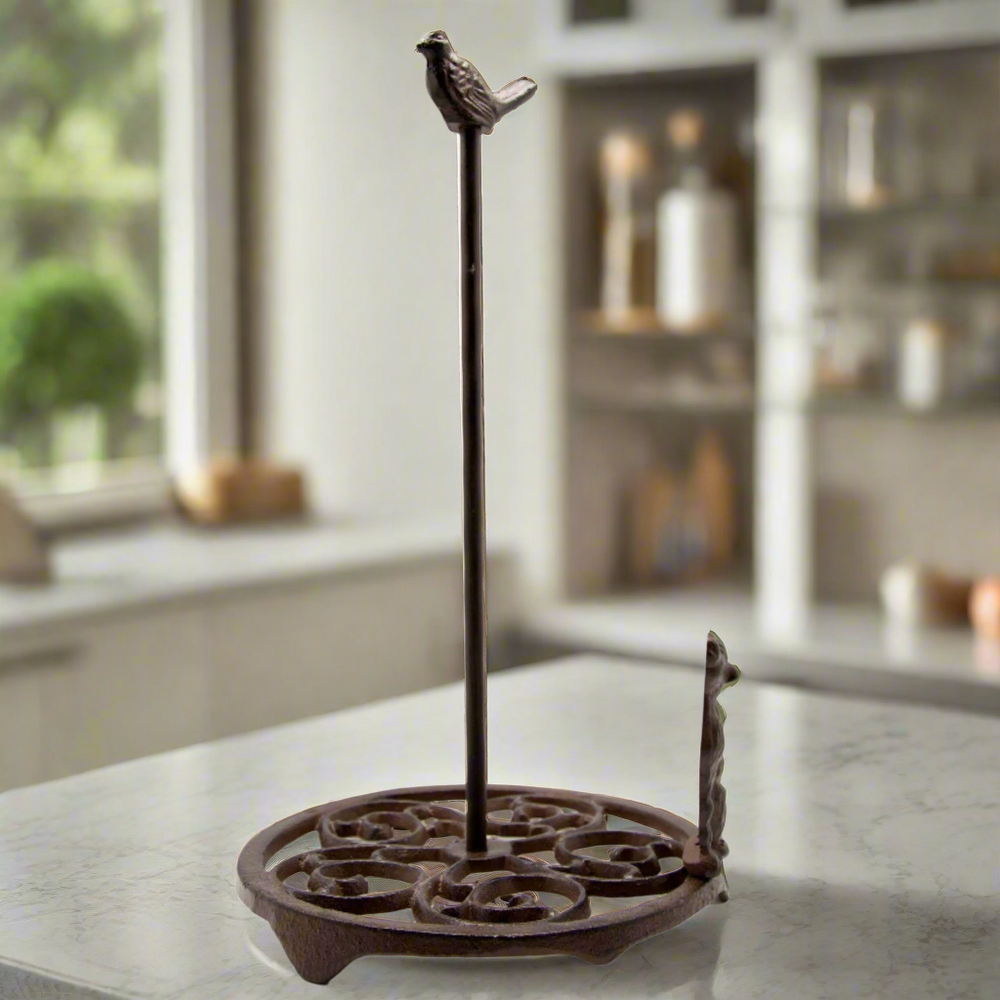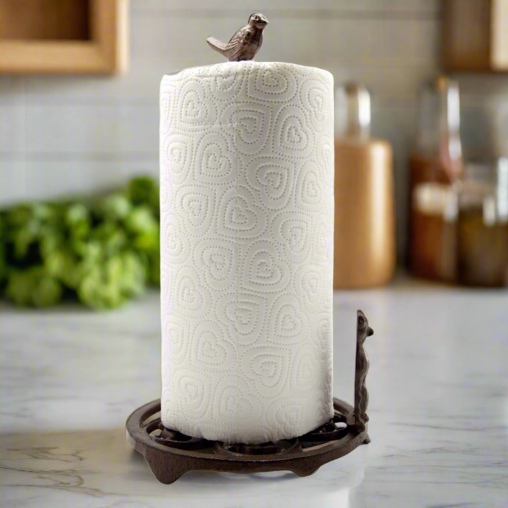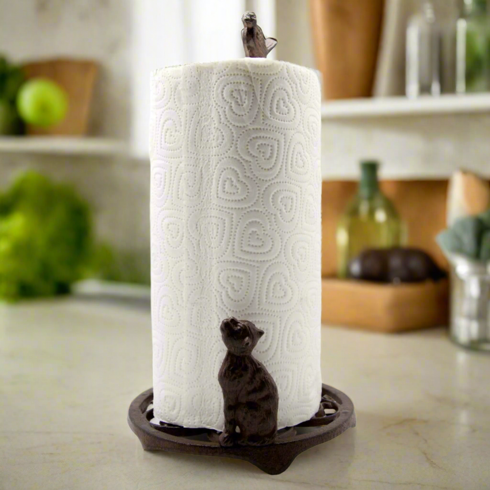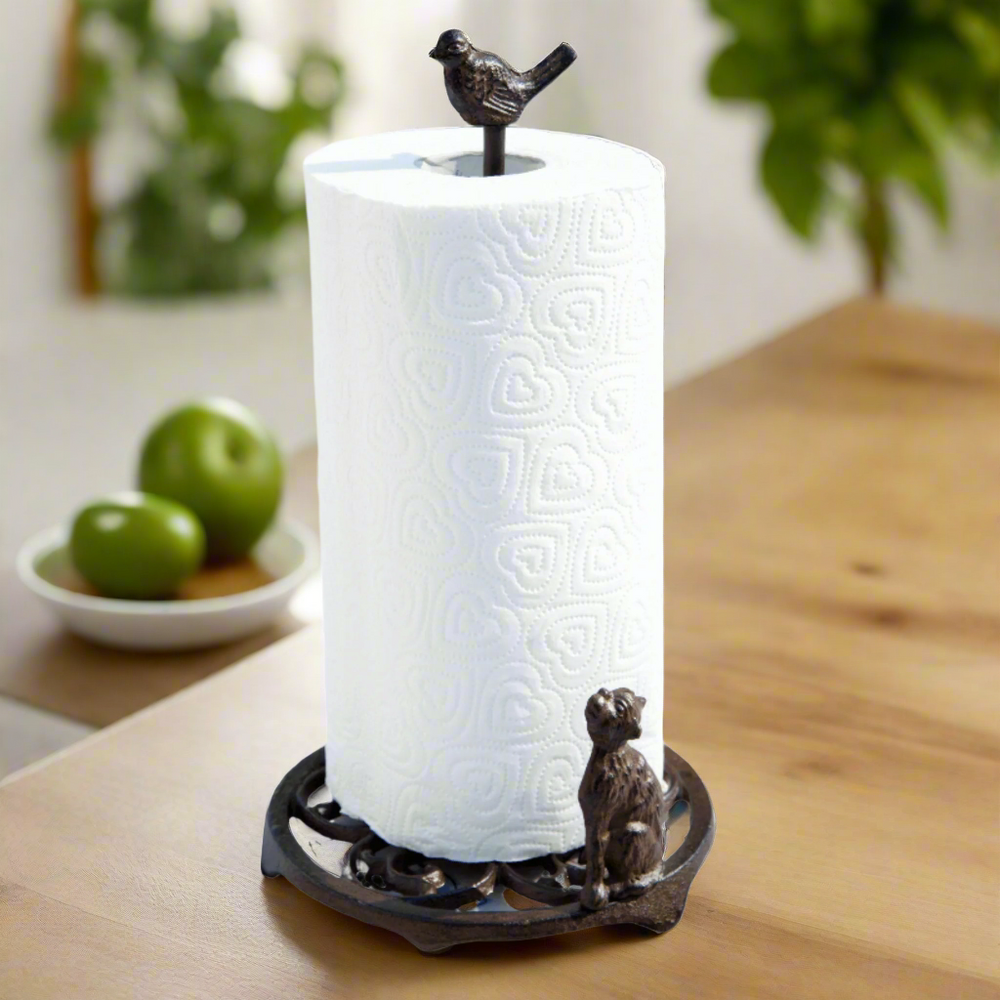 - Kitchen Roll Holder features a bird looking down from atop the slender roll-holder, and a curious cat looking back from below