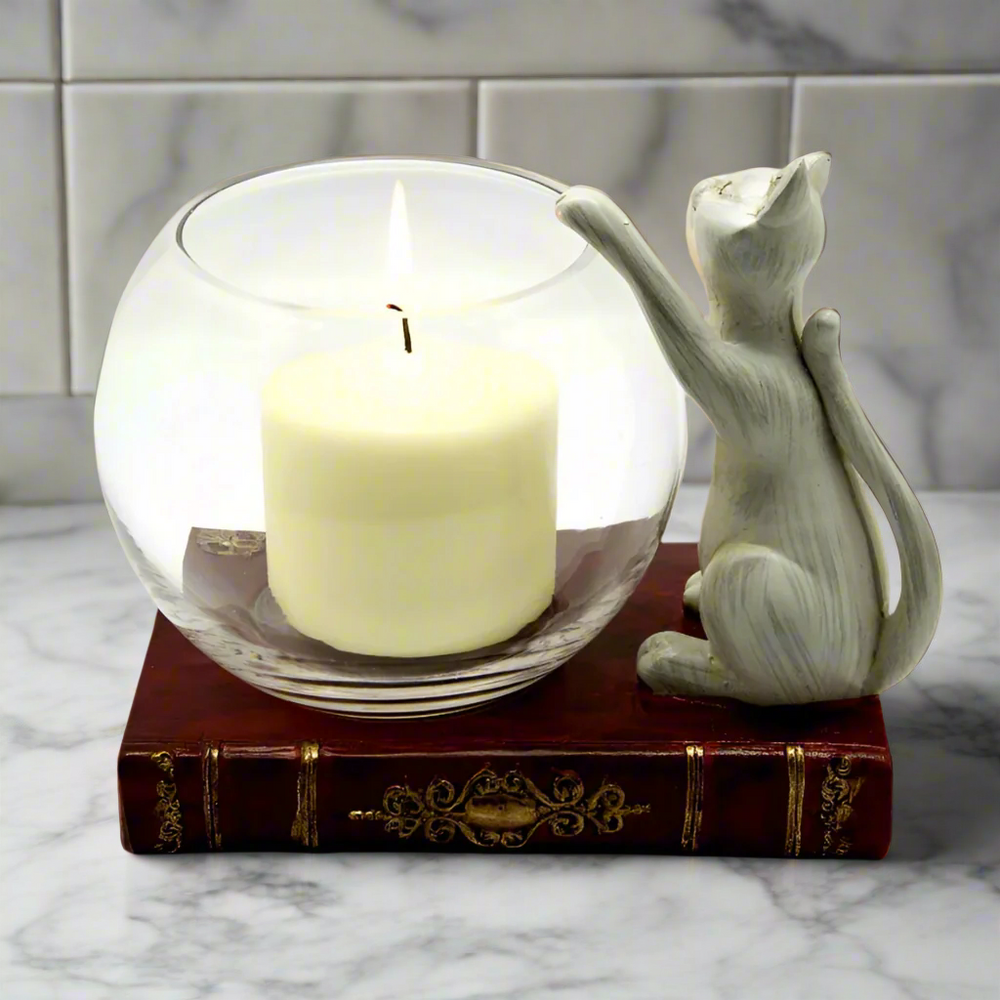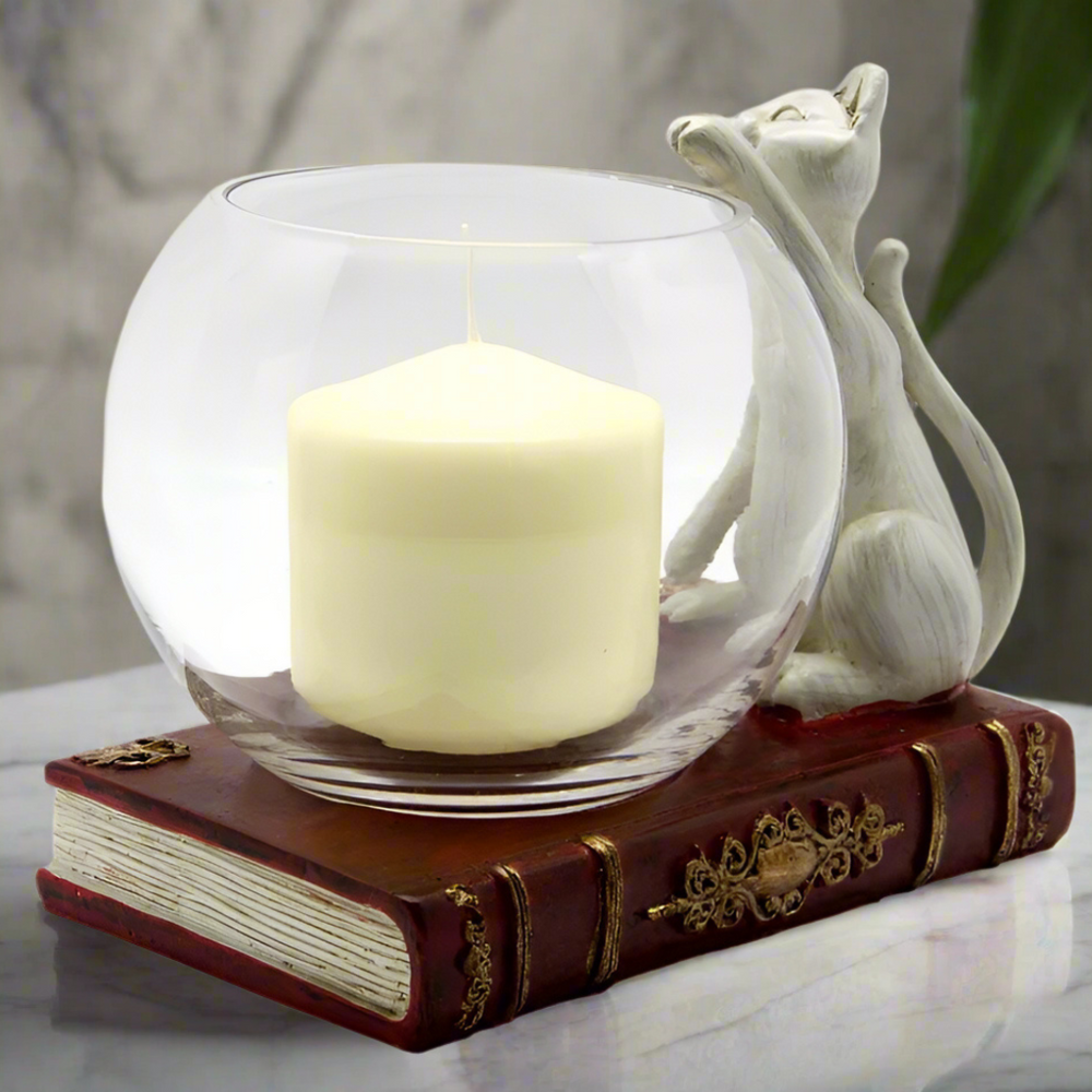 Calling all cat lovers! This unique and playful candle holder is sure to make a purrfect gift for your furry friends. Whether for indoor or outdoor use, the glass shades and resin cat and book add a quirky touch to any space. Don't forget to light it up with a 7.5cm candle (not included)! Measuring 19cm in length, 18cm in height, and 14.5cm in width, this charming ornament is a must-have for any cat-themed decor collection.
