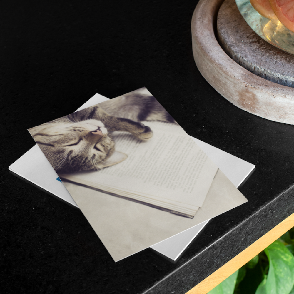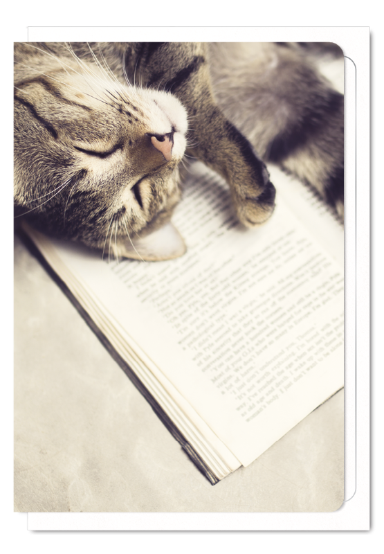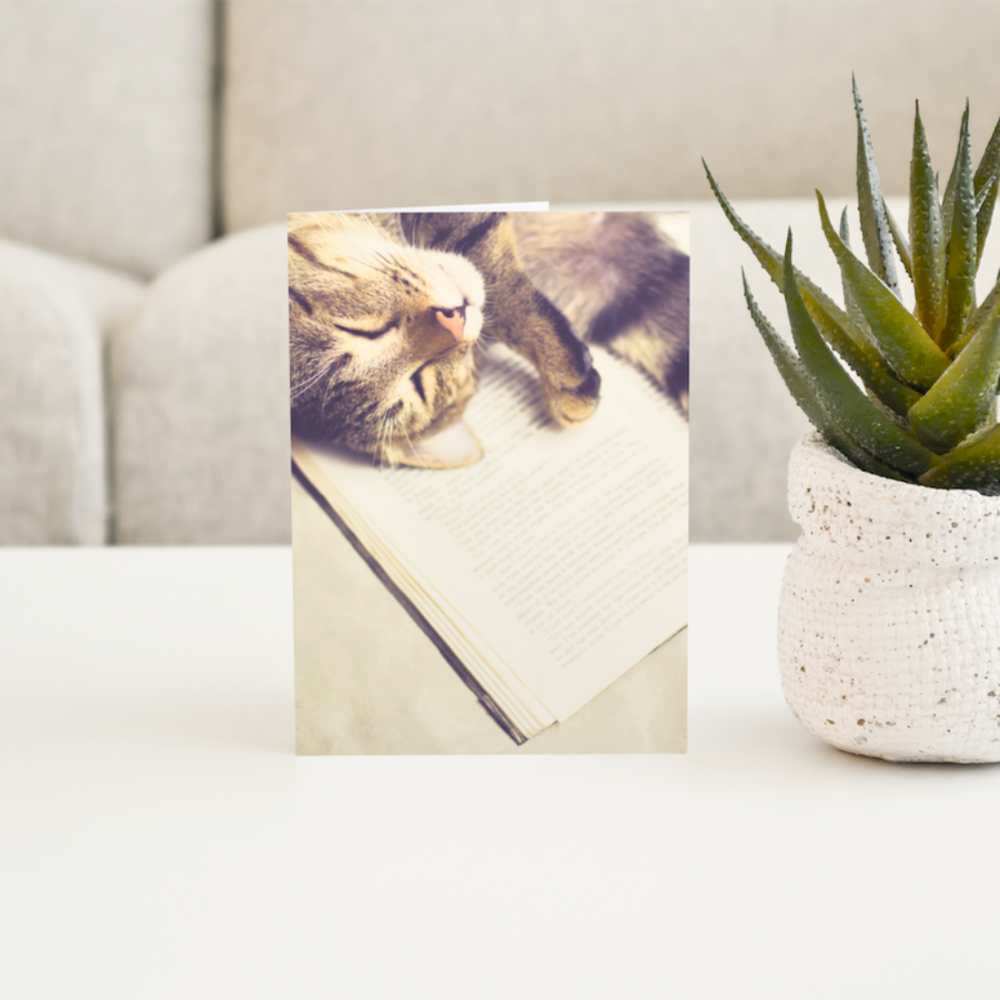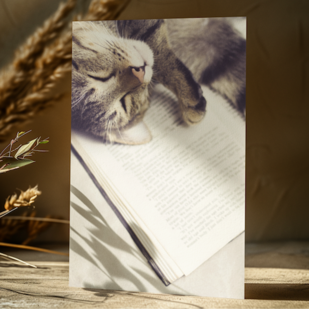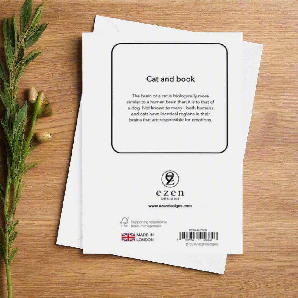 This cat and book greeting card is purrfect for anyone who loves animals and books. The card features a beautiful cat and is made with high-quality pearlescent paper that has a shimmering effect. The card is suitable for all occasions and can be sent to anyone, making it a great unisex card.