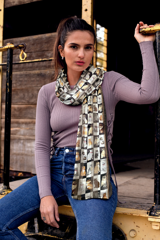This scarf is the purrfect addition to any cat lover's wardrobe. With a charming pattern featuring cats in boxes, it's sure to bring a smile to your face. The scarf is made from a soft and lightweight chiffon feel polyester material, making it comfortable to wear all year round.
