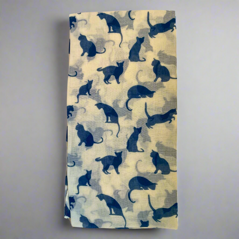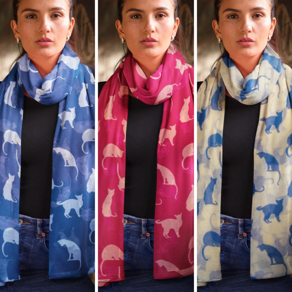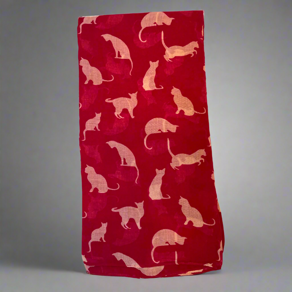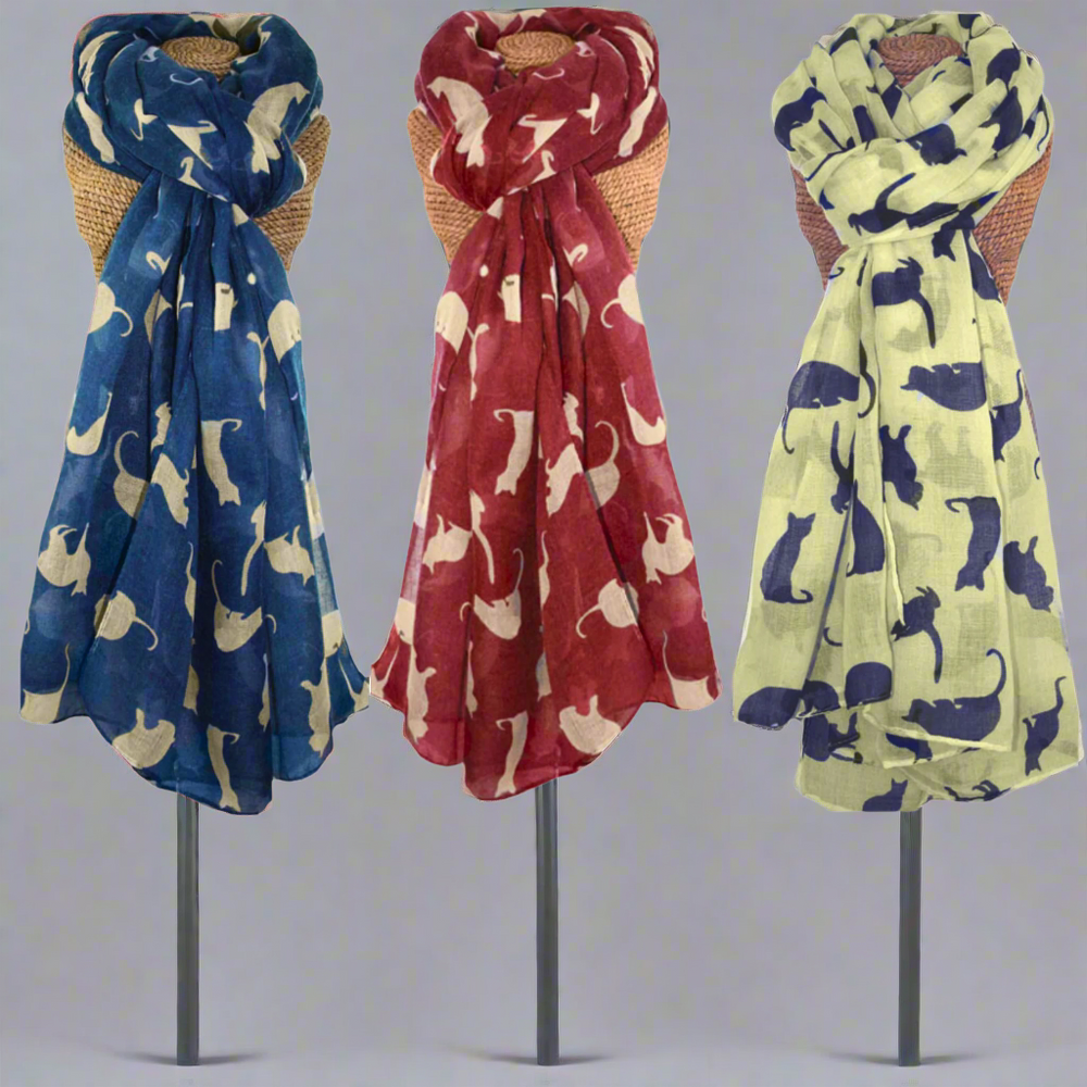 Embrace your love for feline friends with this charming cat print scarf, a versatile addition to any wardrobe. This lightweight ladies' scarf features a playful pattern of cats in various colours - blue with white, red with white, and cream with blue - providing a touch of whimsy to your outfits.