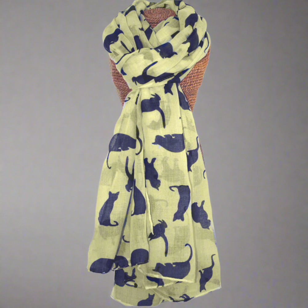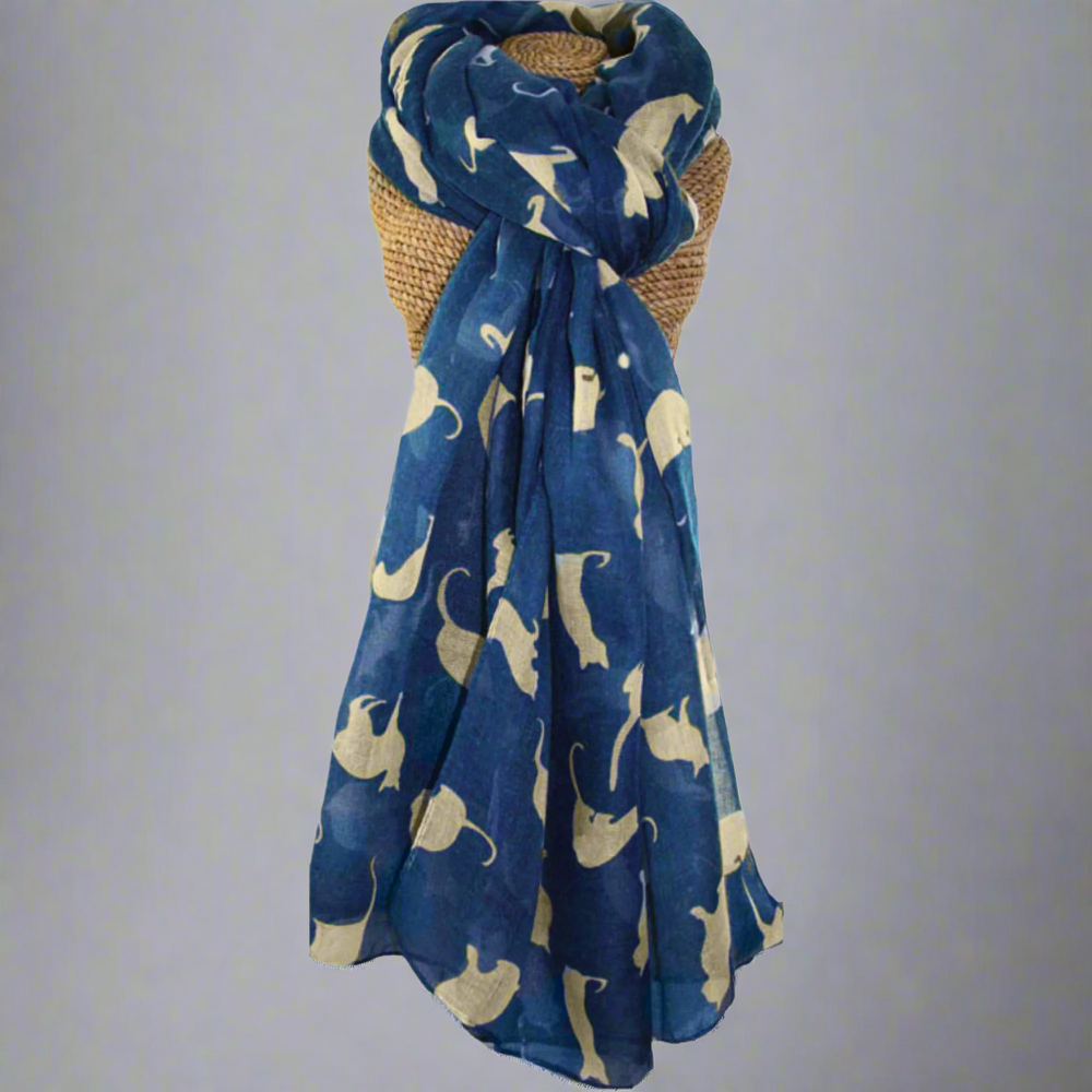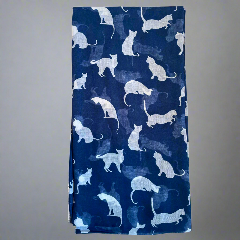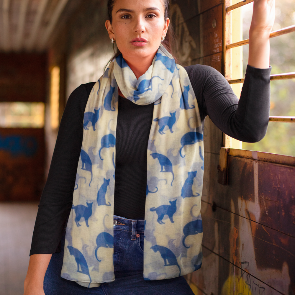 Embrace your love for feline friends with this charming cat print scarf, a versatile addition to any wardrobe. This lightweight ladies' scarf features a playful pattern of cats in various colours - blue with white, red with white, and cream with blue - providing a touch of whimsy to your outfits.