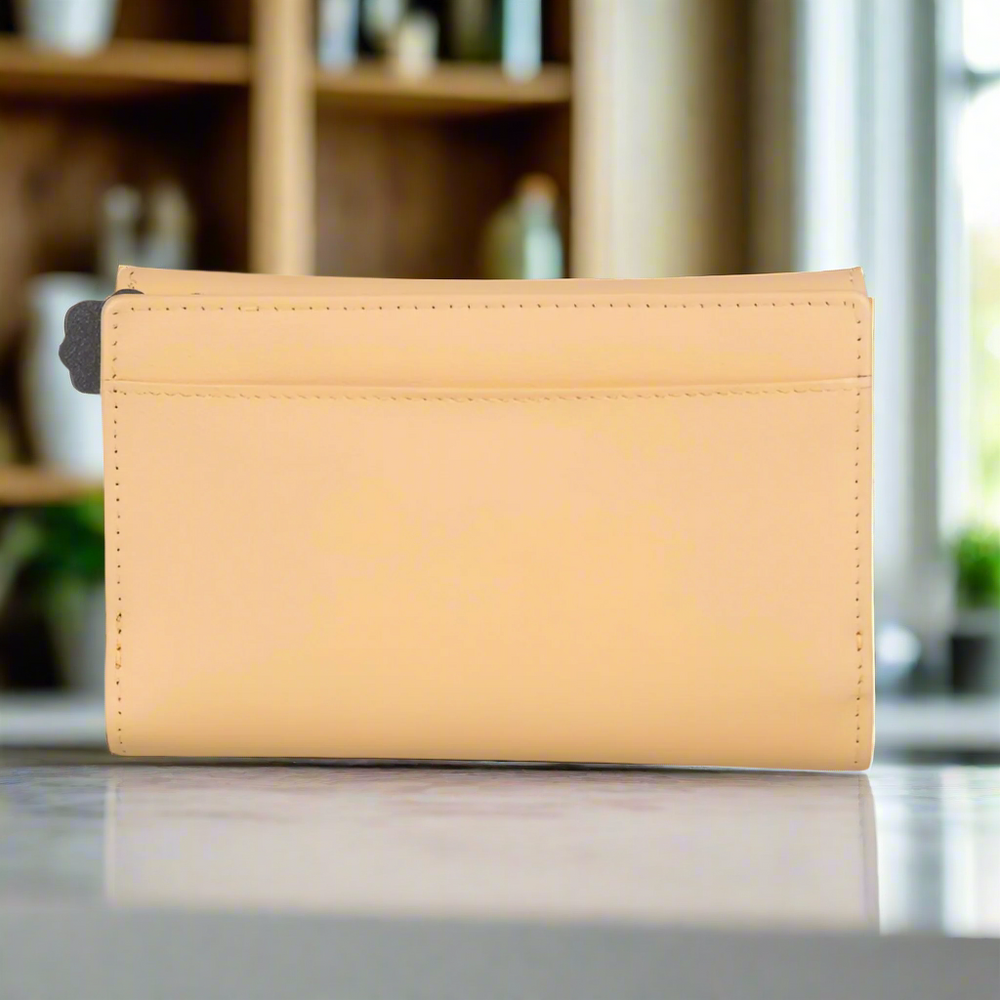 This functional purse is compact and holds up to 17 cards. Inside the tri fold you'll find 2 note compartments, an ID window and zip pocket ideal for receipts.