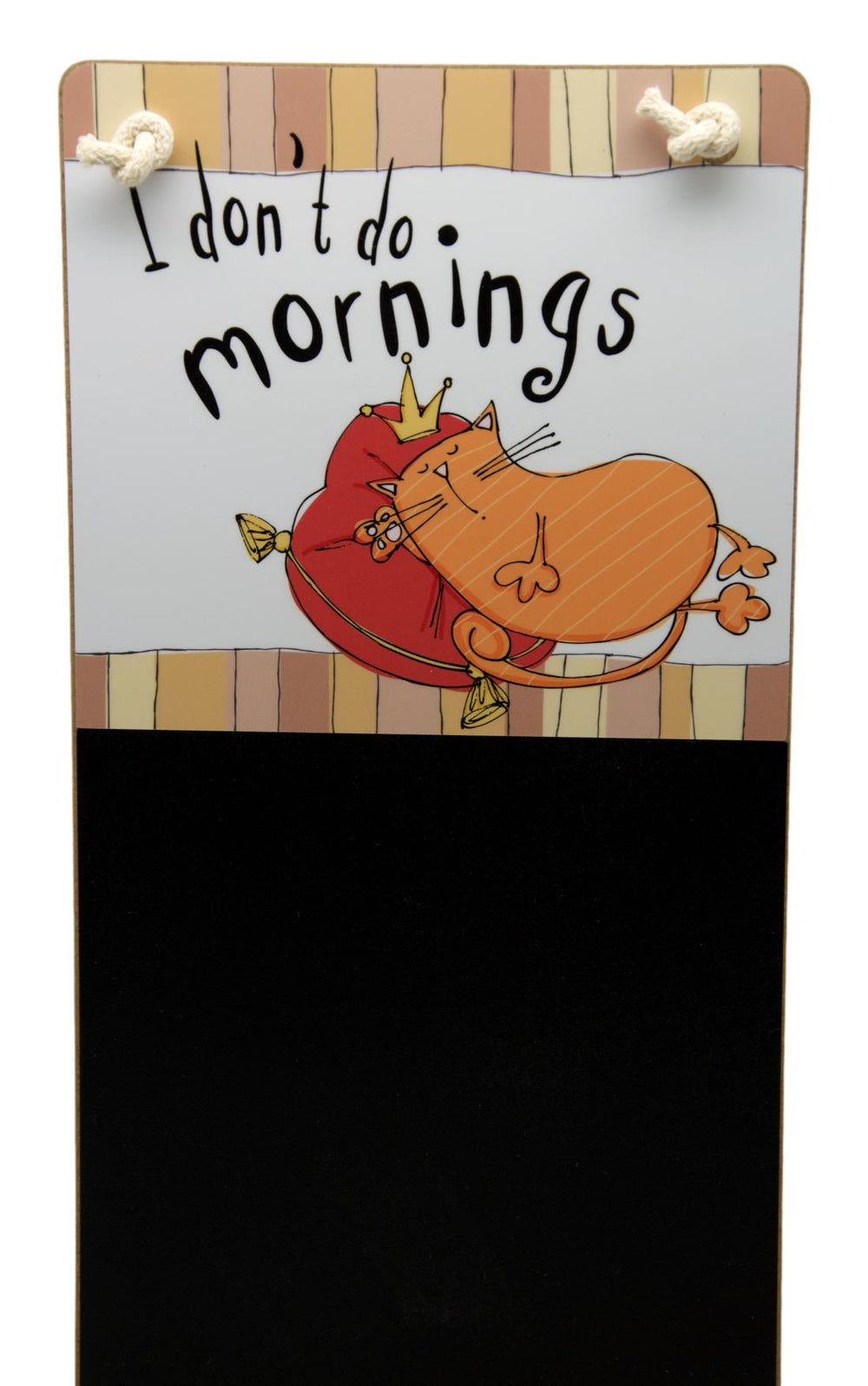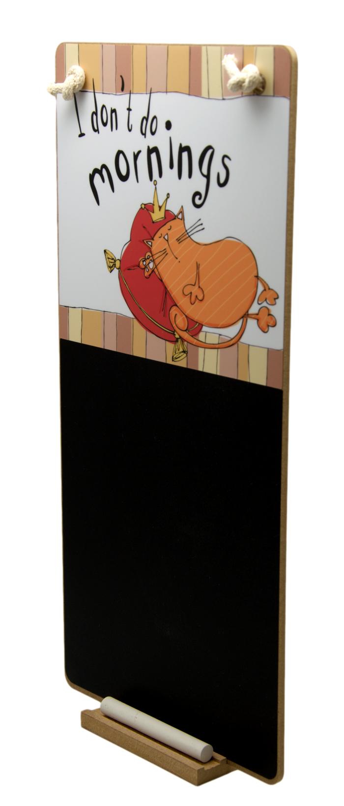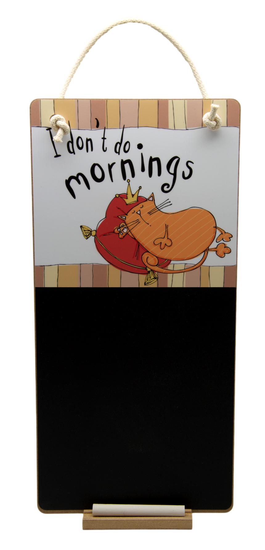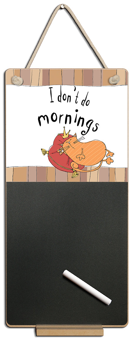 Add a touch of humour and charm to your space with this cat-themed hanging chalkboard! Featuring a playful orange cat illustration and the witty phrase: "I don't do mornings" this decorative message board is perfect for cat lovers.