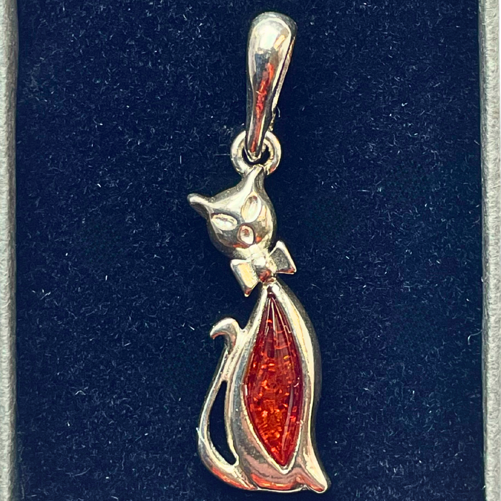 Elegant 925 Sterling Silver and Amber Cat Pendant with Bowtie