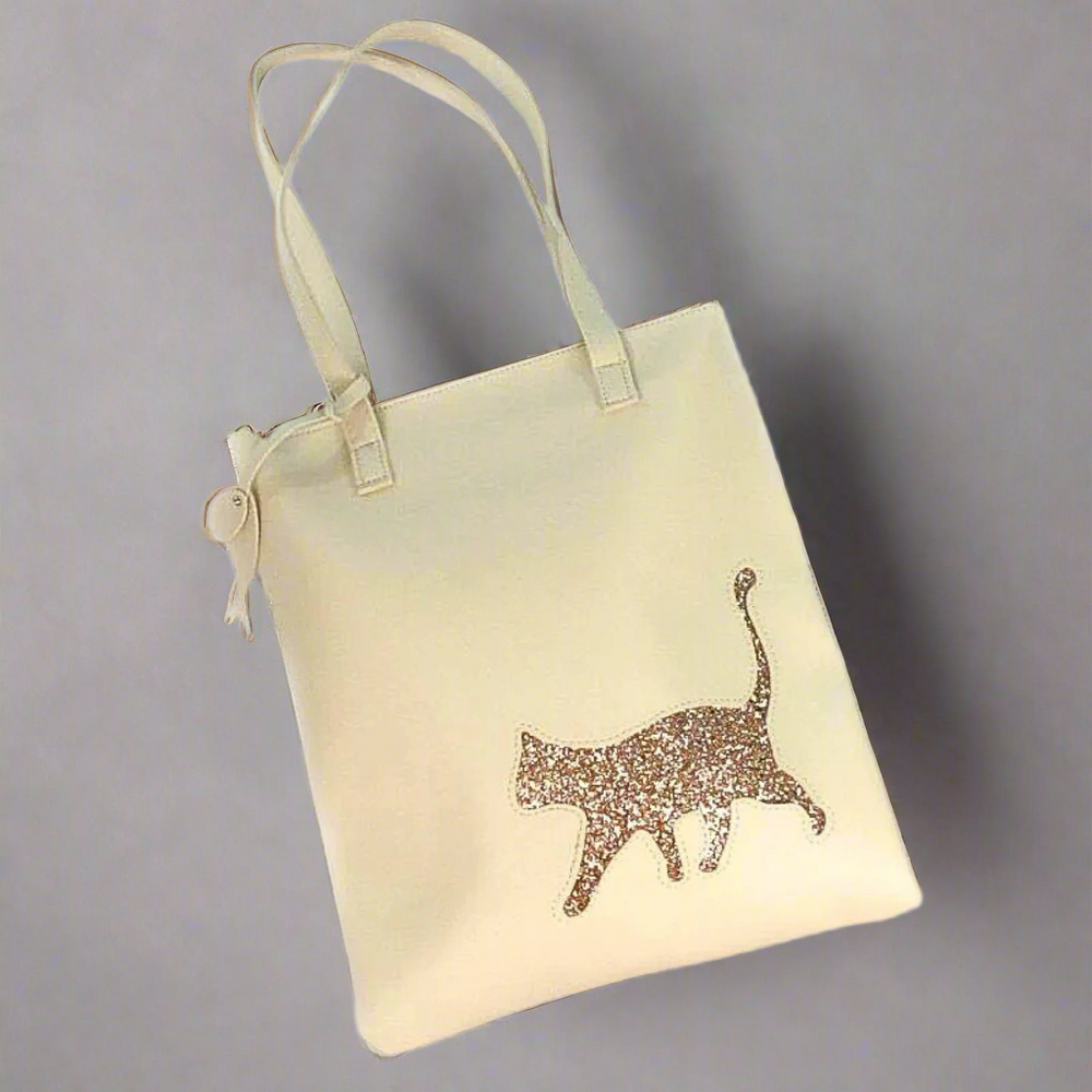 This elegant and stylish tote bag is the perfect blend of sophistication and charm. Crafted from high-quality cream-colored faux leather, it features a beautifully embroidered glittery cat silhouette, adding a touch of personality and sparkle. A matching fish-shaped charm dangles from one of the sturdy double straps, enhancing the bag's playful yet refined aesthetic.