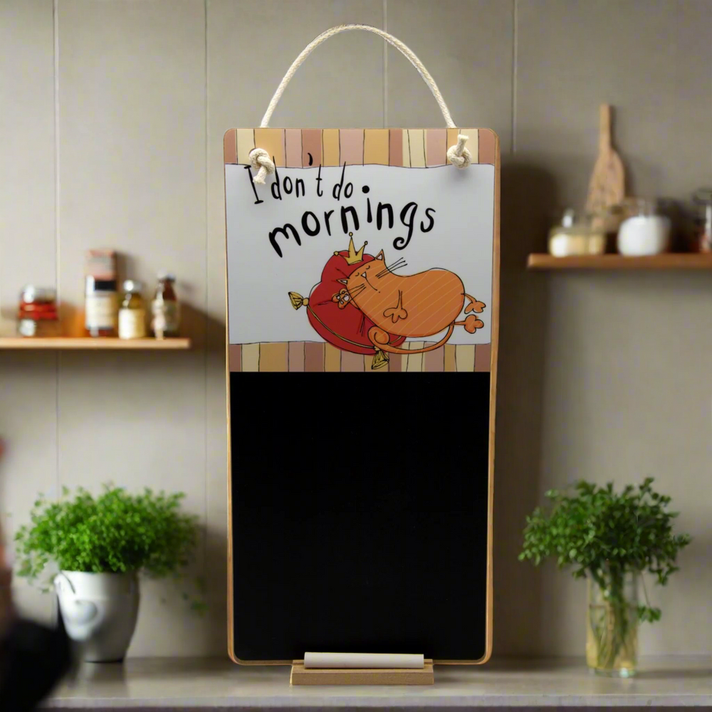 Add a touch of humour and charm to your space with this cat-themed hanging chalkboard! Featuring a playful orange cat illustration and the witty phrase: "I don't do mornings" this decorative message board is perfect for cat lovers.