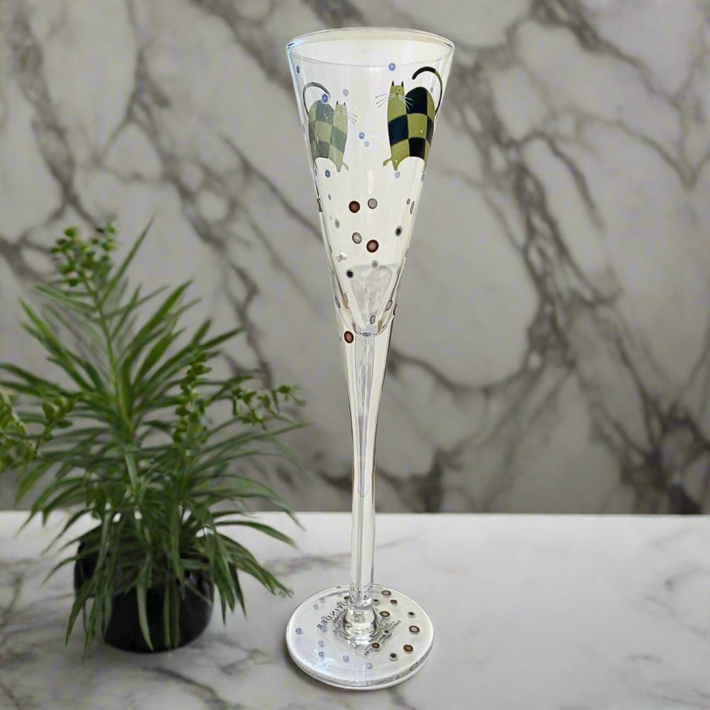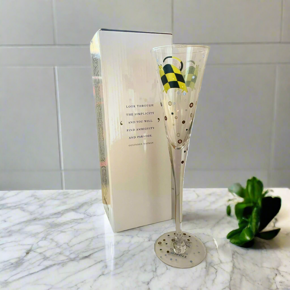 Enjoy your celebration with a touch of feline elegance! This beautifully designed flute glass by renowned artist Govinder Nazran features his signature quirky cat illustrations, blending playful patterns with bold colours.