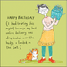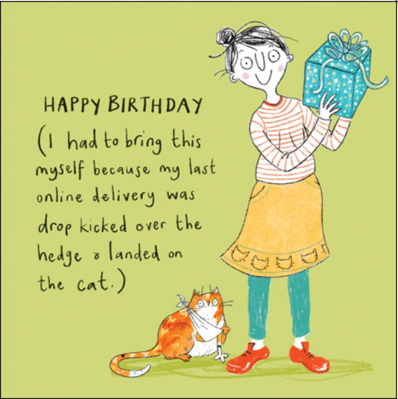 - Message on Front Reads: Happy Birthday (I had to bring this myself because my last online delivery was drop kicked over the hedge and landed on the cat)