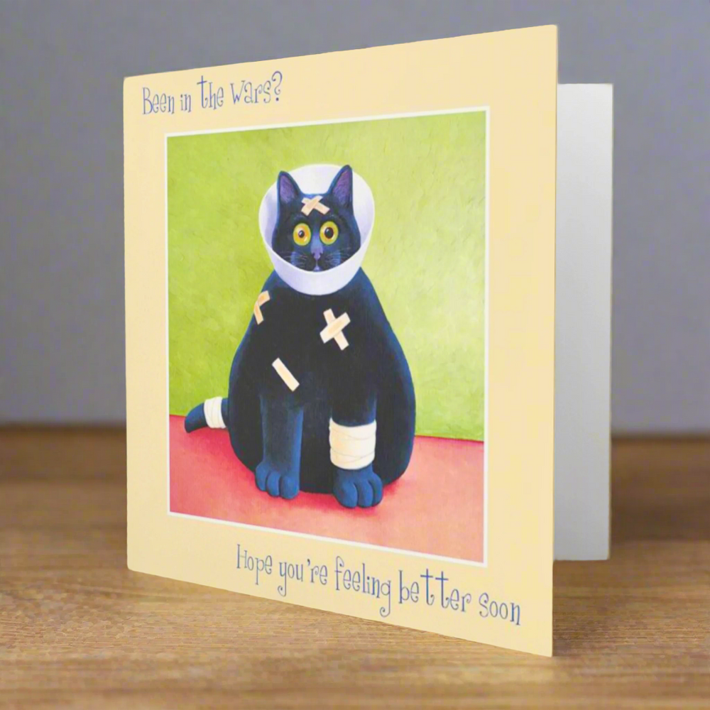 Whether it's a mischievous adventure gone wrong or just an unlucky day, this black cat knows what it means to be In the Wars. With wide, bewildered eyes, an oversized cone of shame, and a patchwork of bandages, this heartwarming and humorous design by Vicky Mount is the perfect pick-me-up for anyone feeling under the weather.