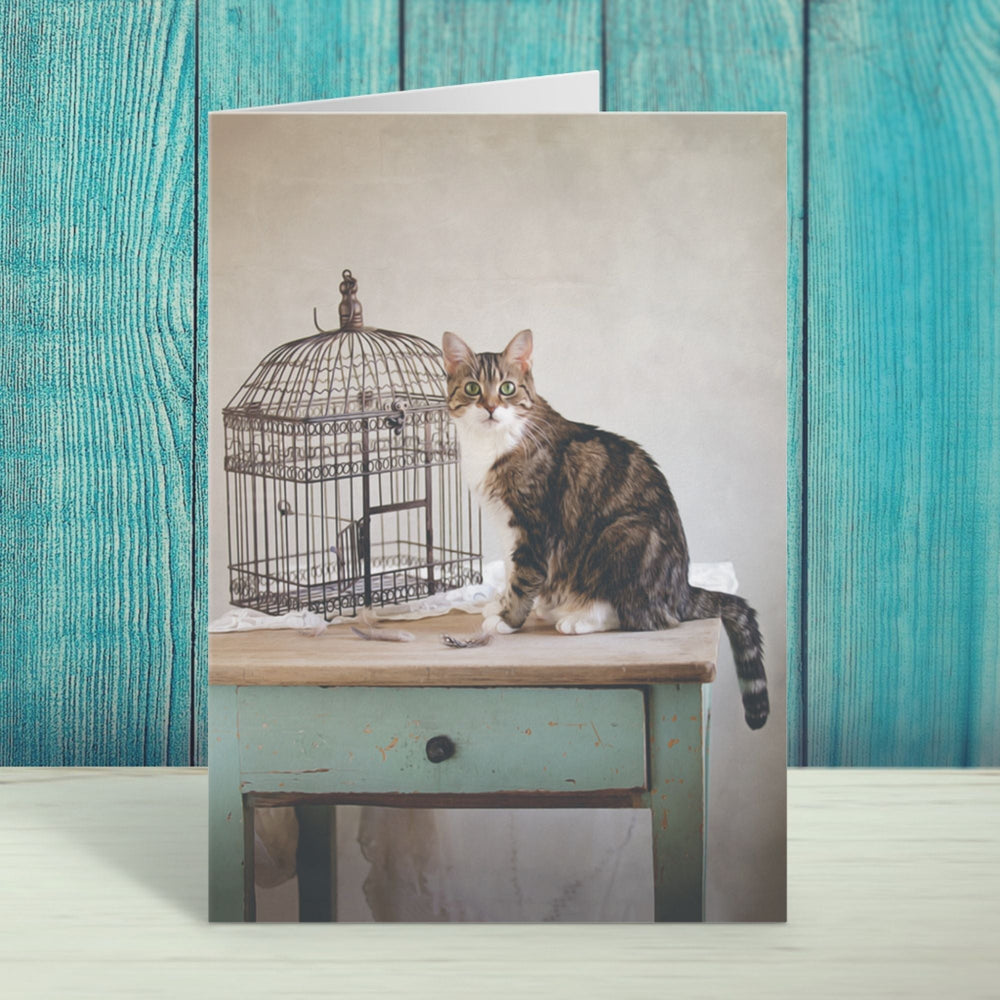 Feathers on the floor, an empty birdcage, and a cat looking as innocent as an angel? Oh yes, we’ve all seen this look before!