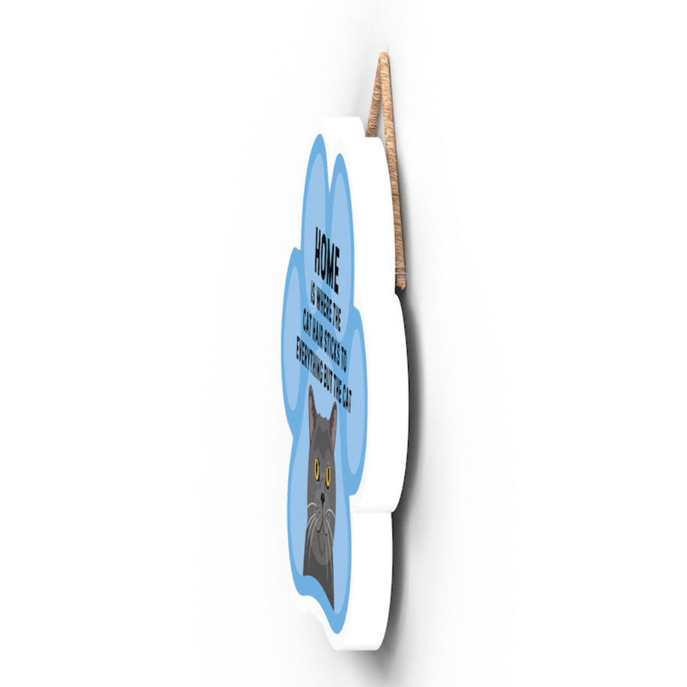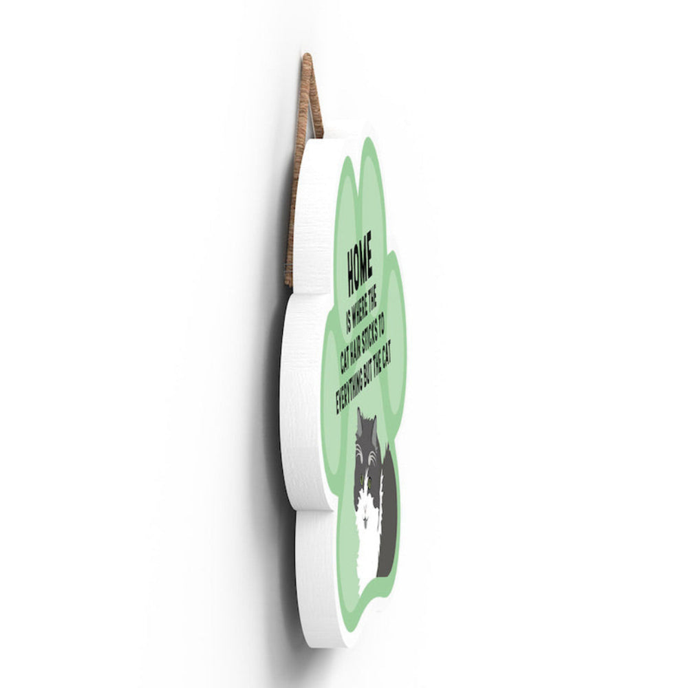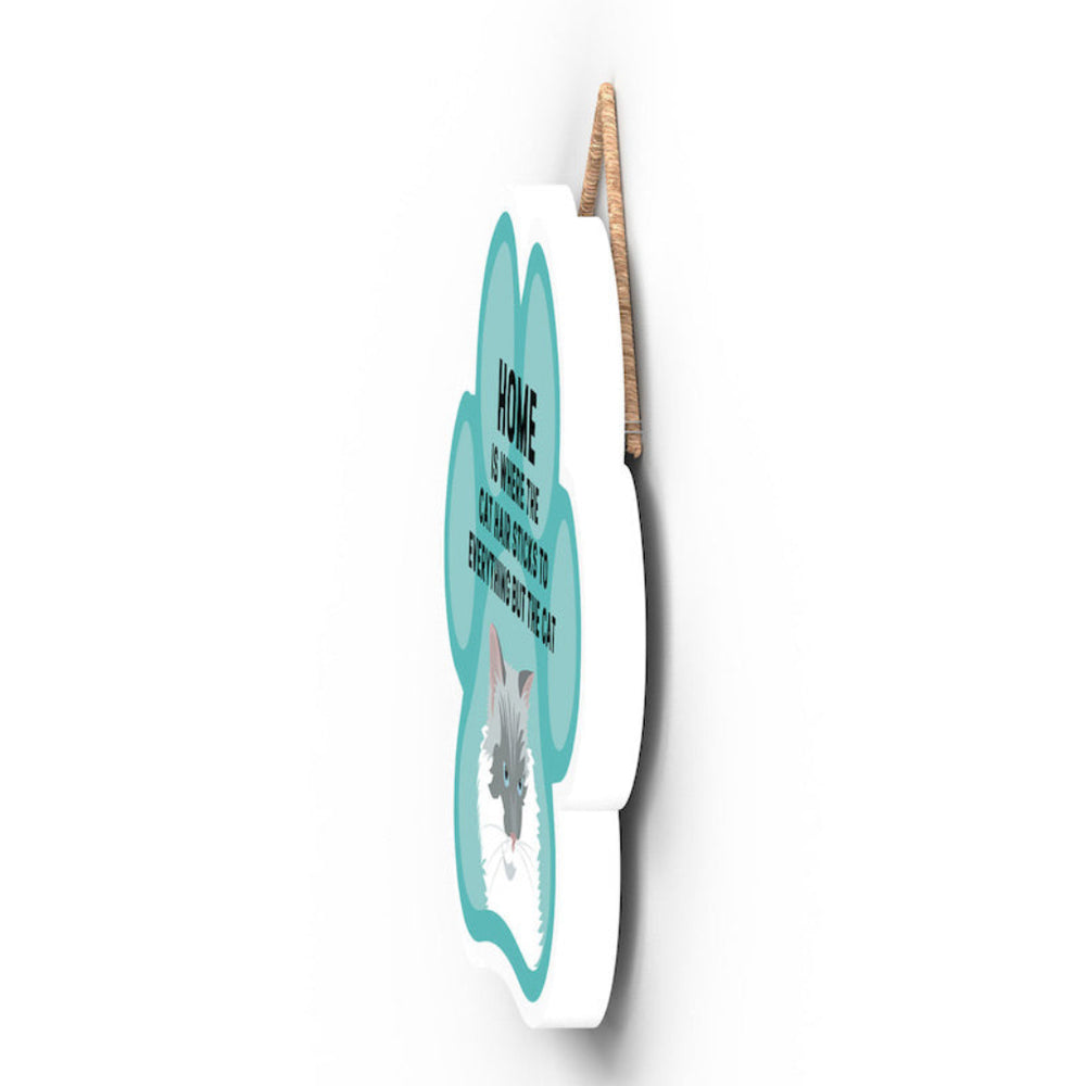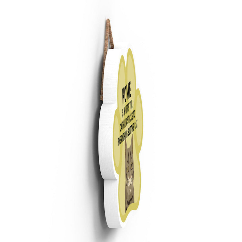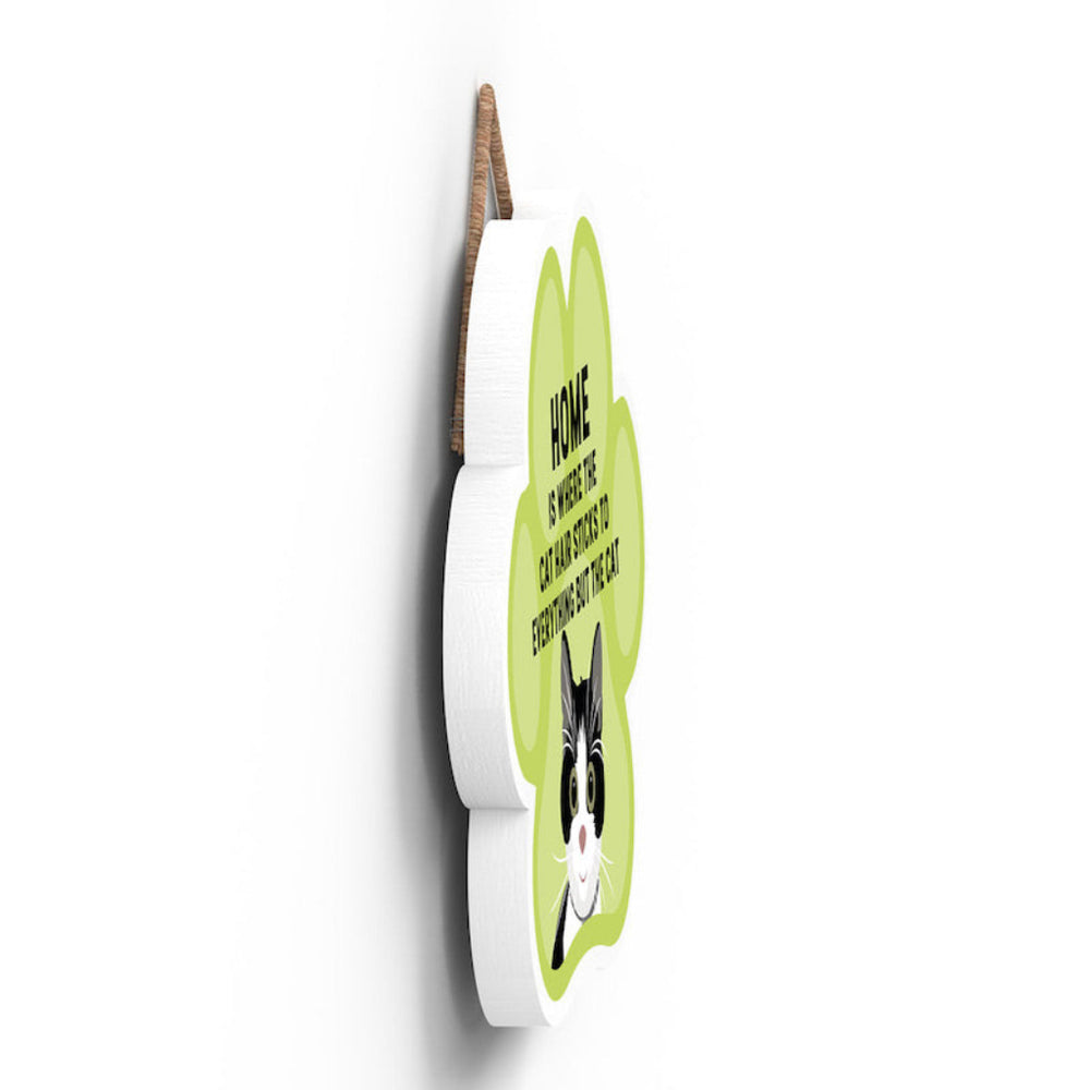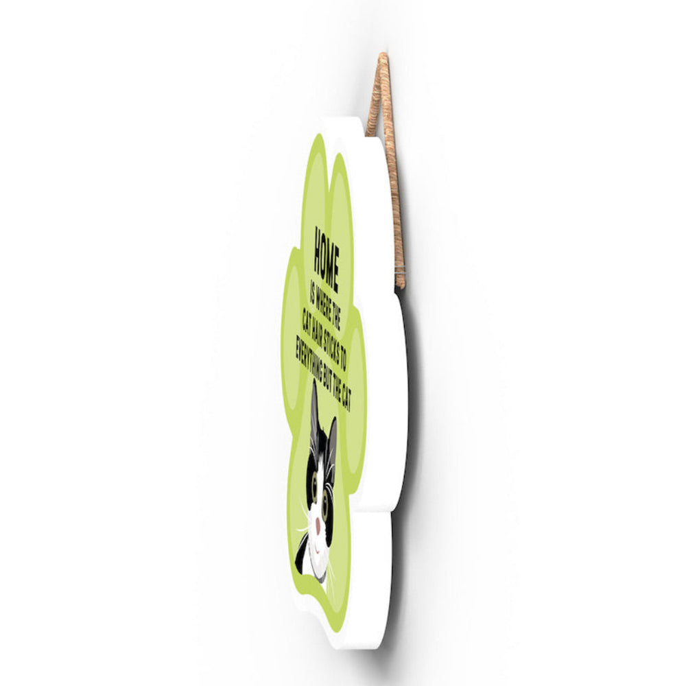 This wooden hanging sign by Vivid Squid is the purrfect decorative item for any cat lover's home. Featuring a colourful Cat Paw Shape, it has the words "HOME is Where the Cat Hair Sticks to Everything But The Cat" printed on it in a fun and humorous way. Measuring 9.2cm in height and 9.9cm in width, this sign is handmade by Katie Pearson and can be hung in any room of your house.