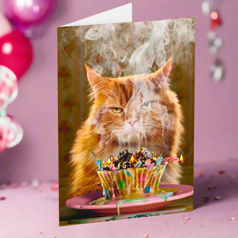 Ever made a birthday wish and instantly regretted it? This cat knows the feeling. With smouldering candles, a melted mess of a cupcake, and a look that screams "I’m too old for this," this card is perfect for those who embrace birthday chaos with a side of sarcasm.