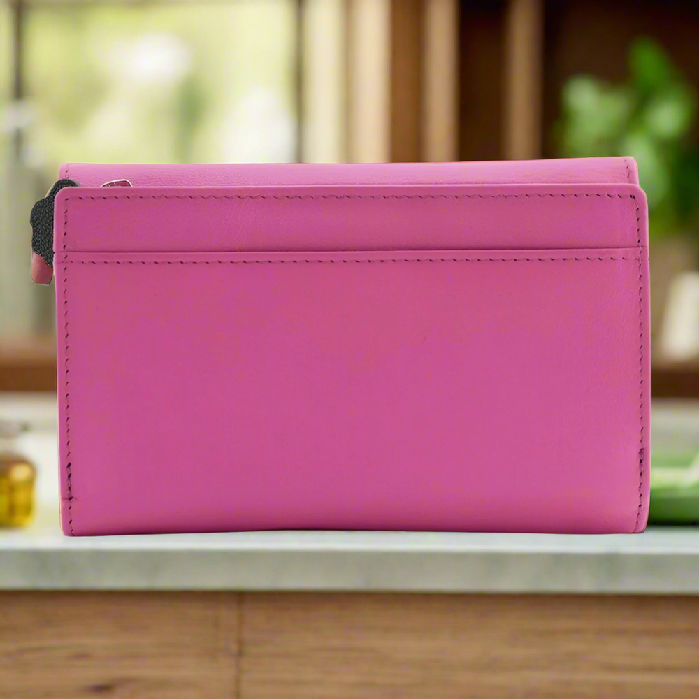 This functional purse is compact and holds up to 17 cards. Inside the tri fold you'll find 2 note compartments, an ID window and zip pocket ideal for receipts.