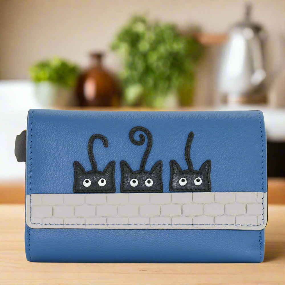 This functional purse has been lovingly created from smooth leather and finished with three cute cats peeking over a wall.
