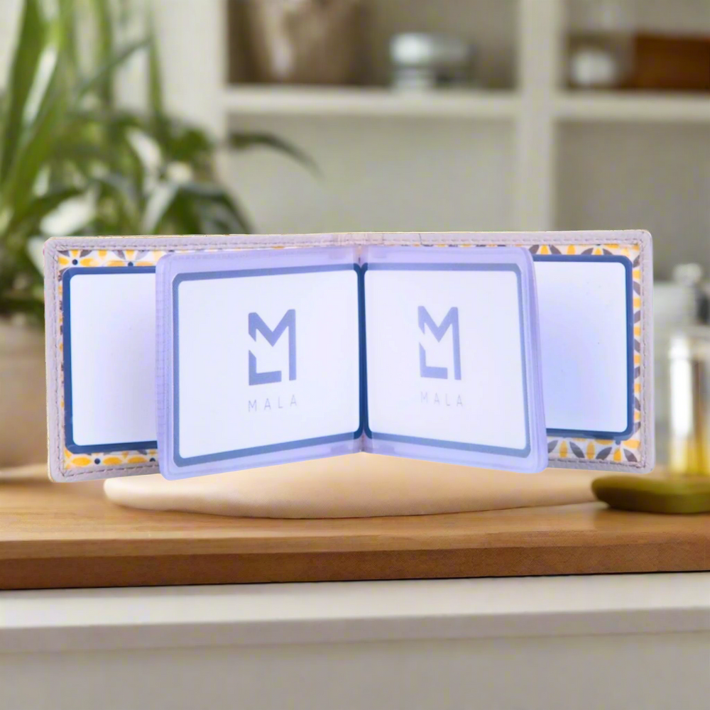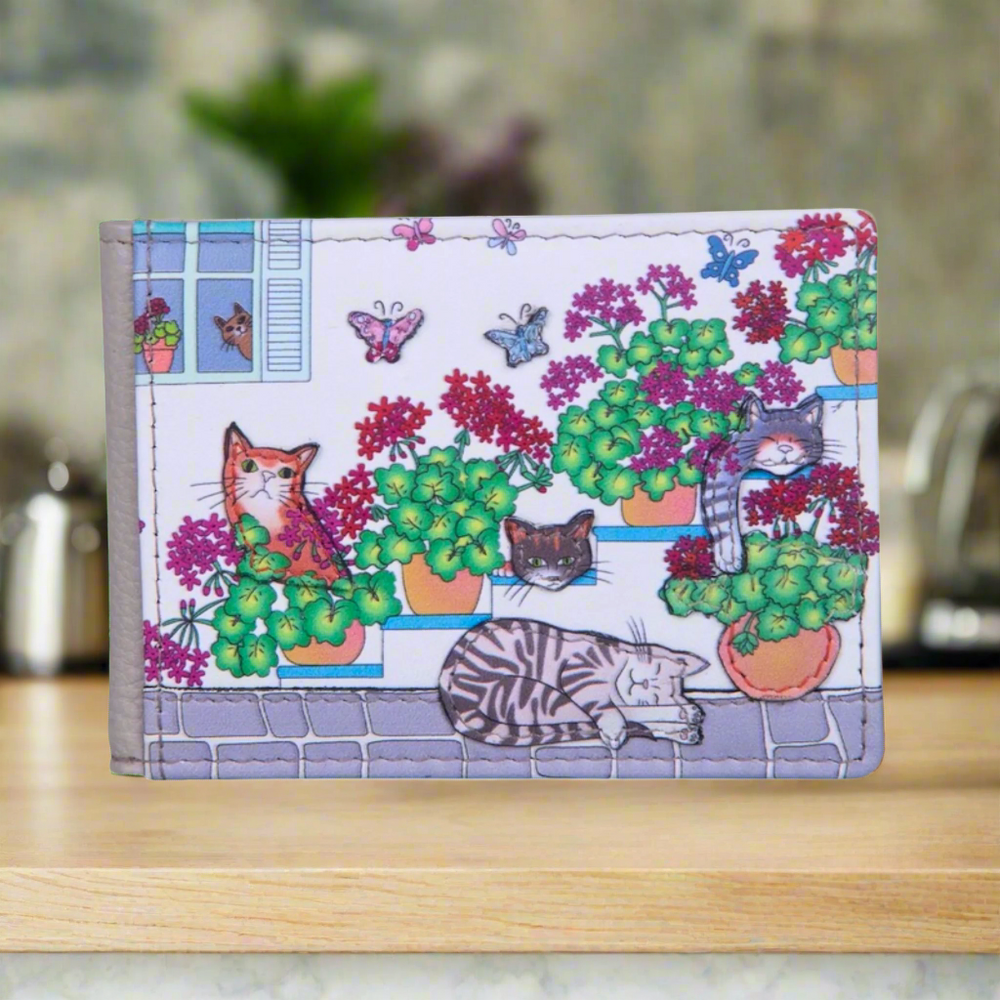 This charming card holder wallet by Mala Leather is inspired by the beautiful Greek island of Santorini and features a delightful embroidered pattern of cats. The wallet is made of high-quality leather and blended fabric and measures 10cm in length and 7cm in width, making it compact and easy to carry.