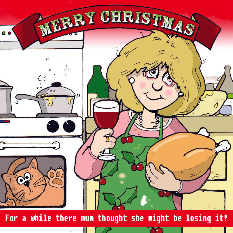 A hilarious Christmas card featuring the Christmas cook clutching a glass of wine in one hand, and the turkey in the other, looking a bit worse for wear! Peering through the oven door is a cat and the text reads For a while there she thought she might be losing it! Purrfect to send Christmas wishes to the wine loving Christmas cook!
