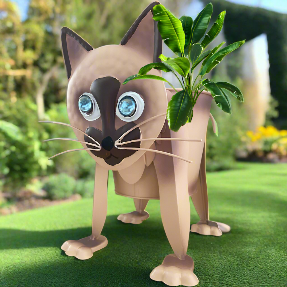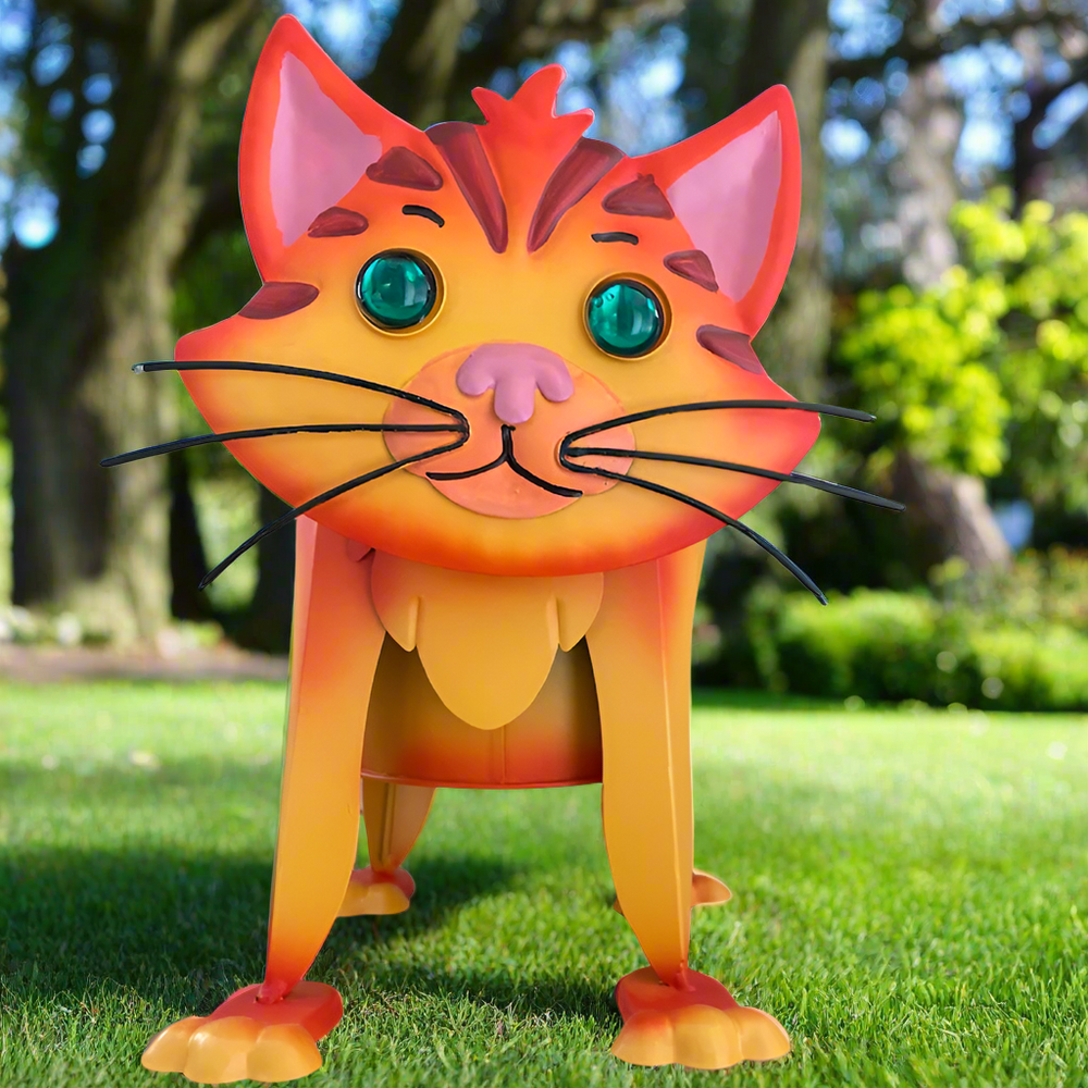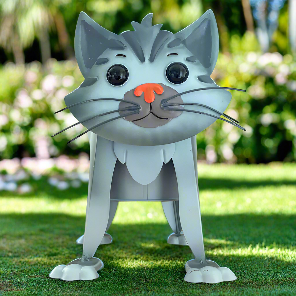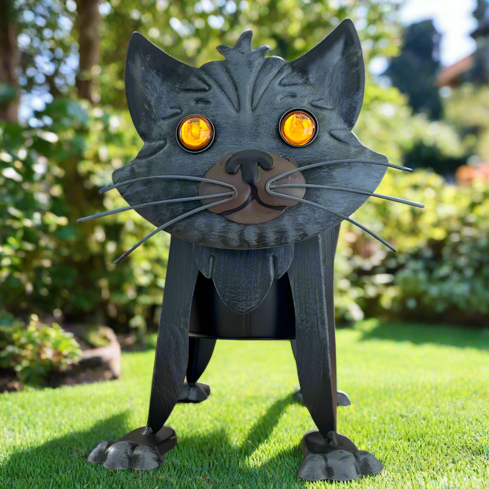 Add a touch of fun and elegance to your garden or home decor with this delightful metal cat ornament planter. The cat-shaped statue features a nodding head and tail, with glass eyes that give it a unique and charming appeal. Measuring 33cm in length, 24cm in height, and 18cm in width, this medium-sized plant holder is suitable for indoor and outdoor use, making it perfect for your porch, balcony, flower bed, or lawn.