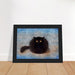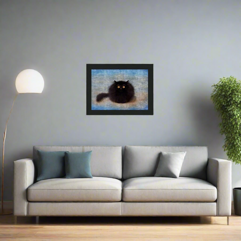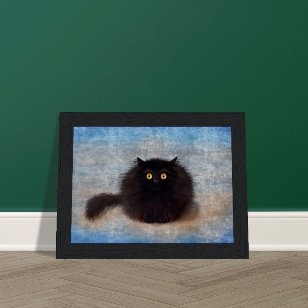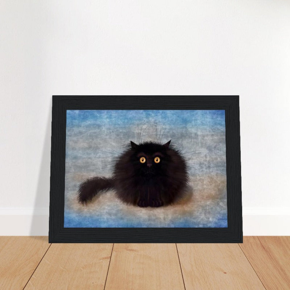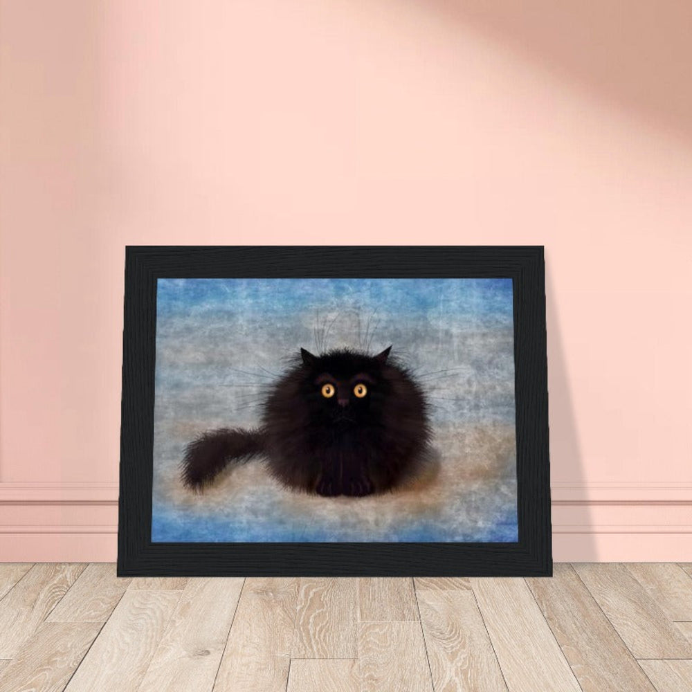 Featuring an illustration of a very cute black fluffy cat with piercing orange eyes, sitting on a beautiful gradient blue background, this wooden framed picture is the perfect combination of sleek and sturdy.