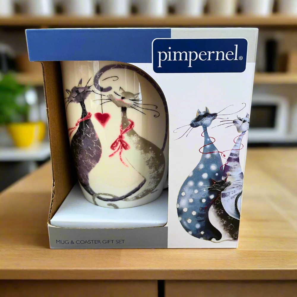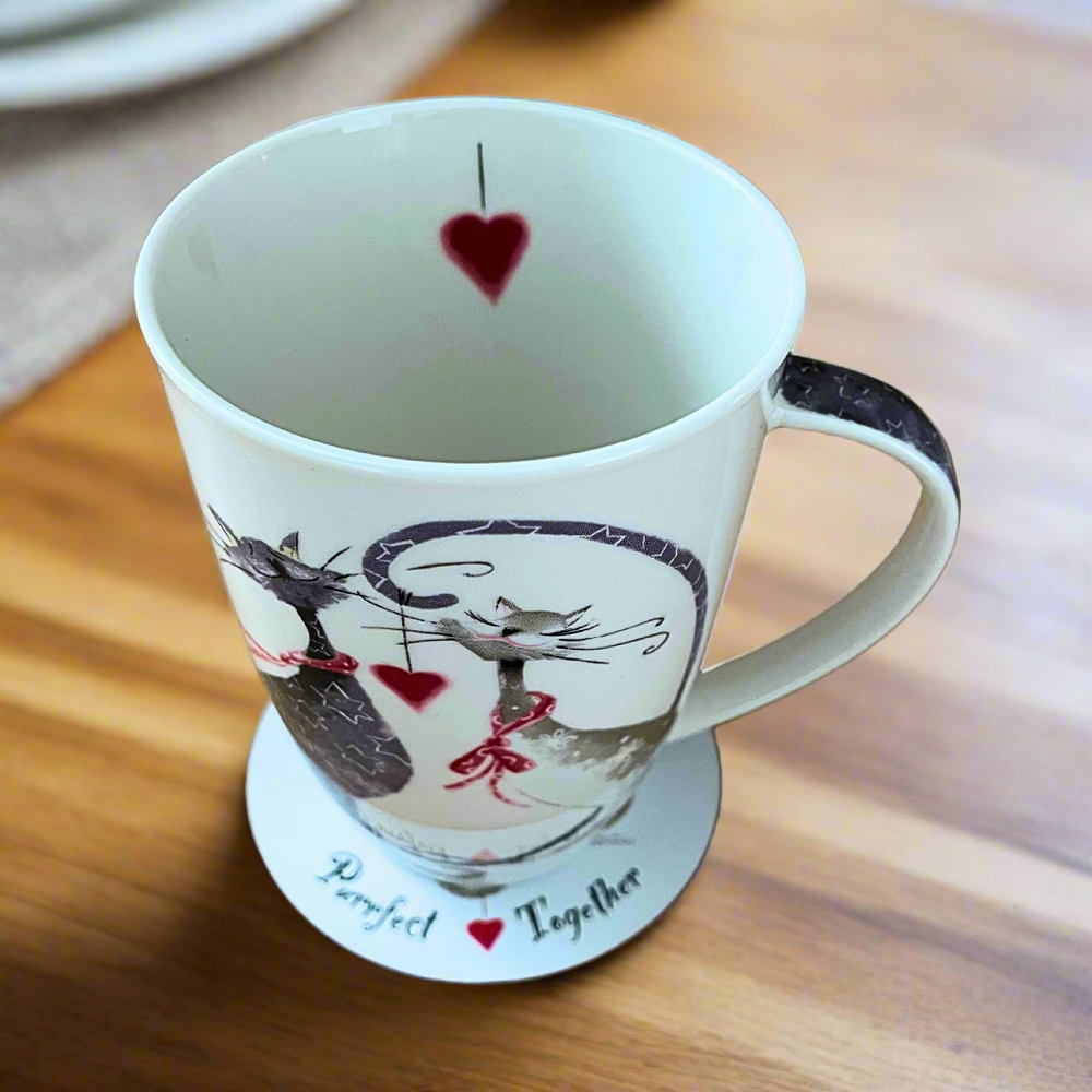 Celebrate love and companionship with the charming "Purrfect Together" Mug and Coaster Set by Cattitudes. Featuring a delightful design of two intertwined cats on the front and the sweet message "Purrfect Together" on the back, this fine porcelain mug is paired with a matching coaster – the perfect gift for cat lovers and romantics alike.