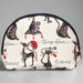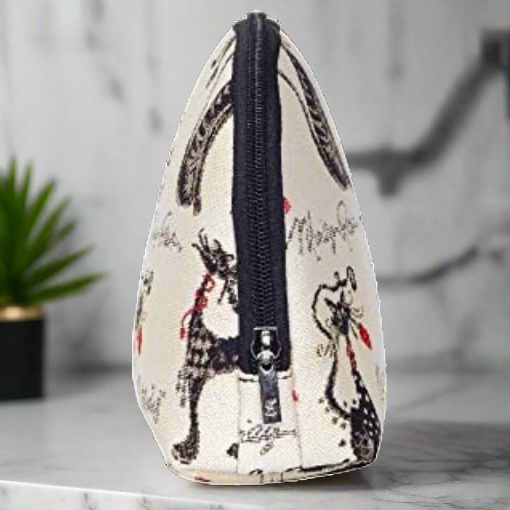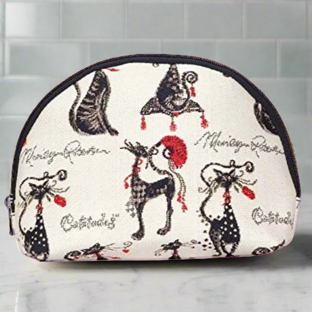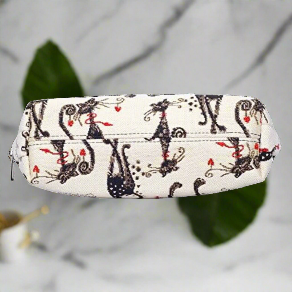 This generously sized makeup pouch is crafted from woven tapestry fabric and features whimsical fashionista cats in black and red, perfect for cat lovers with a bold sense of style.