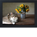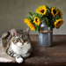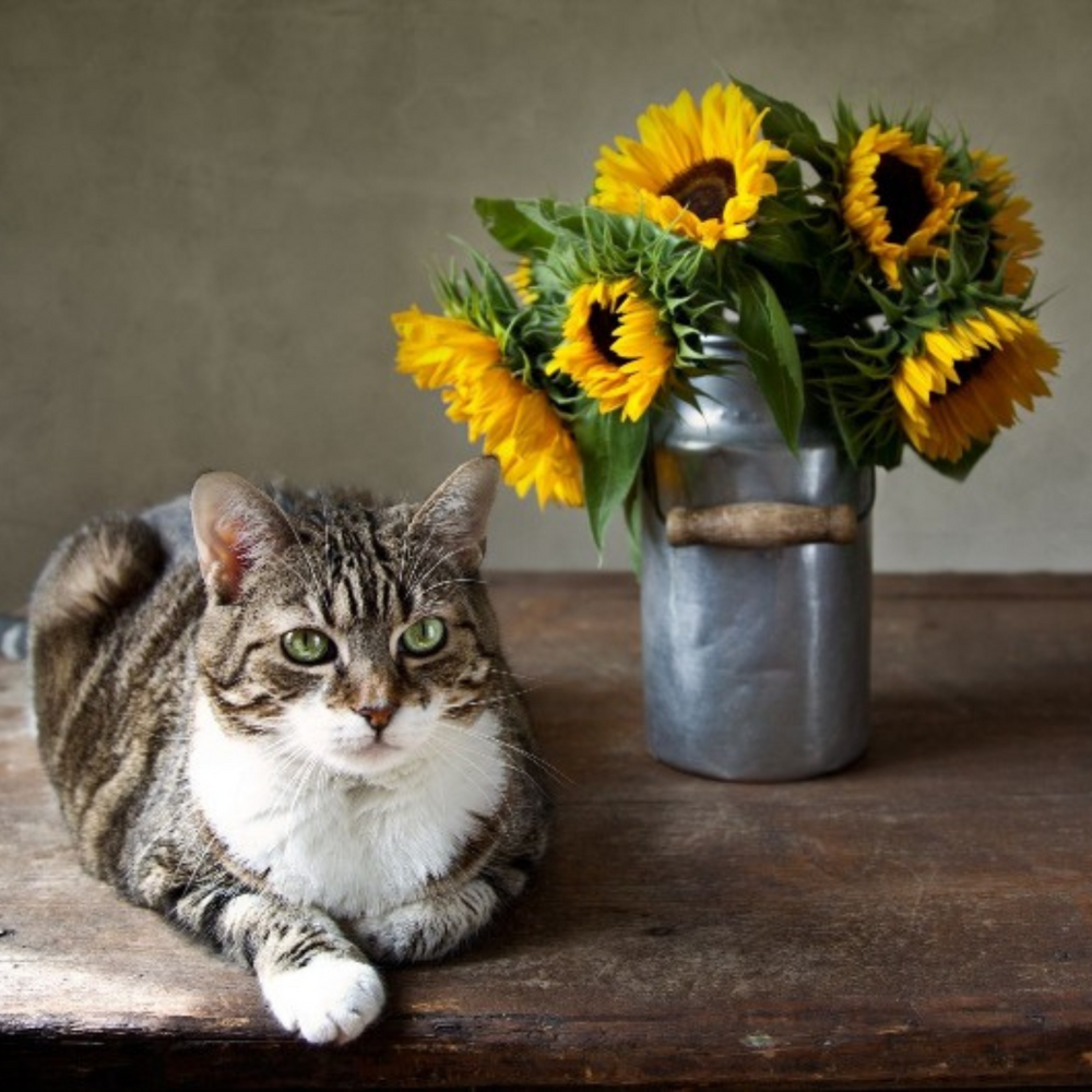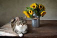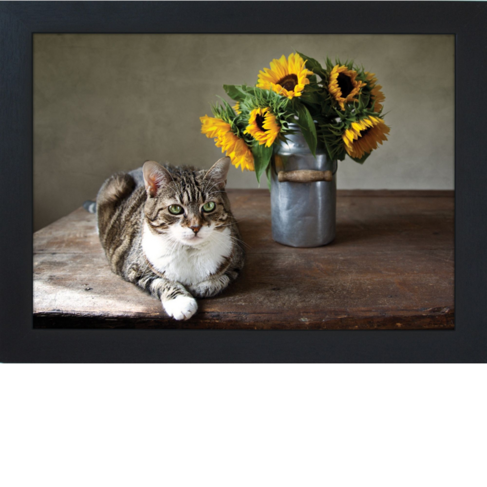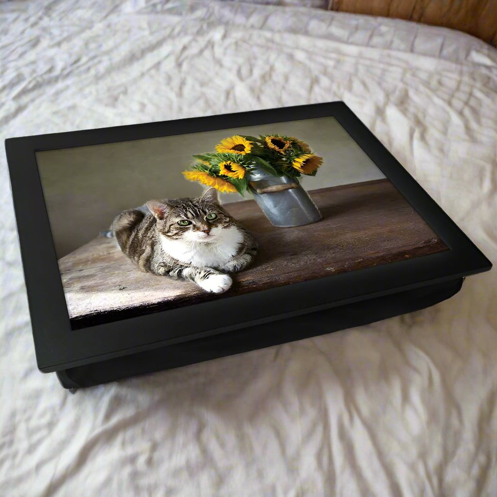 Exclusively designed by Fabulous Felines® Our Sunflower Cat lap tray design features a still life image of a beautiful cat laying on a wooden table with a bouquet of sunflowers displayed in a milk can.