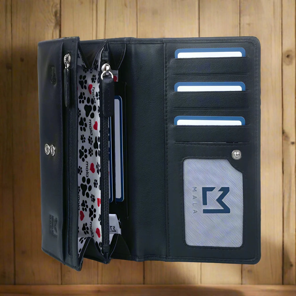 This adorable appliqued cat face leather purse holds up to 9 cards and has two separate note sections. The internal zipped pocket holds change securely and the ID window is ideal for passes.