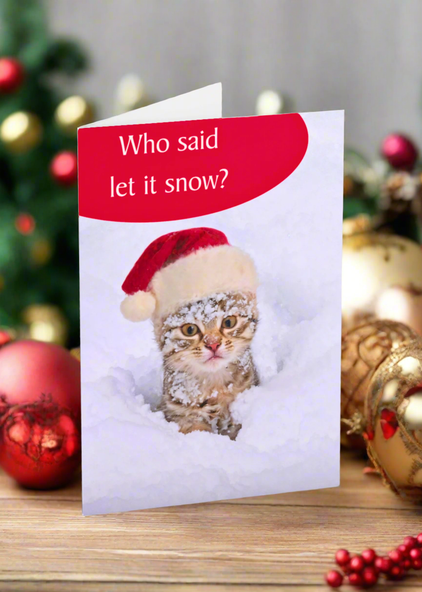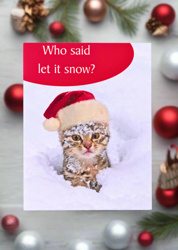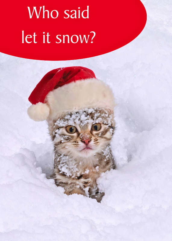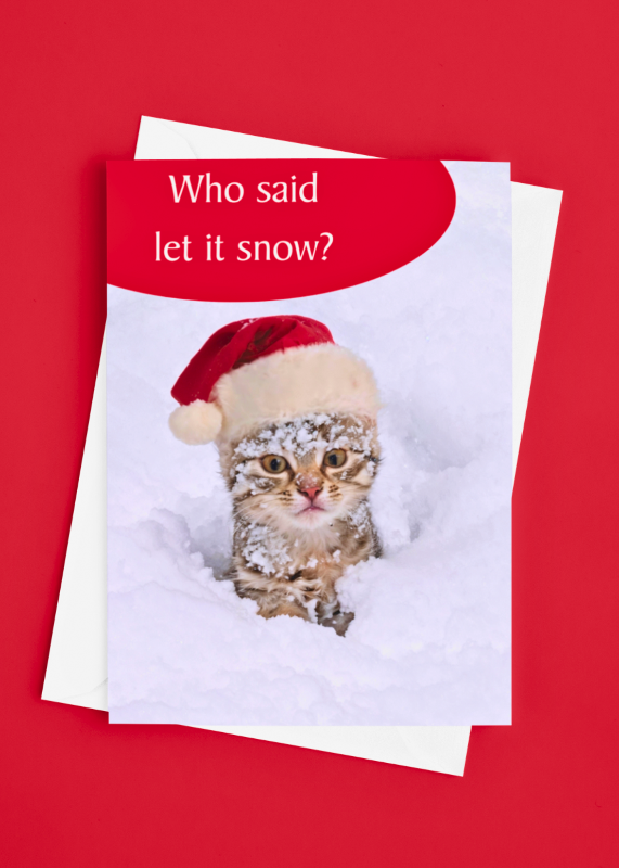 - Design: Snow-covered cat with the caption “Who said let it snow?”