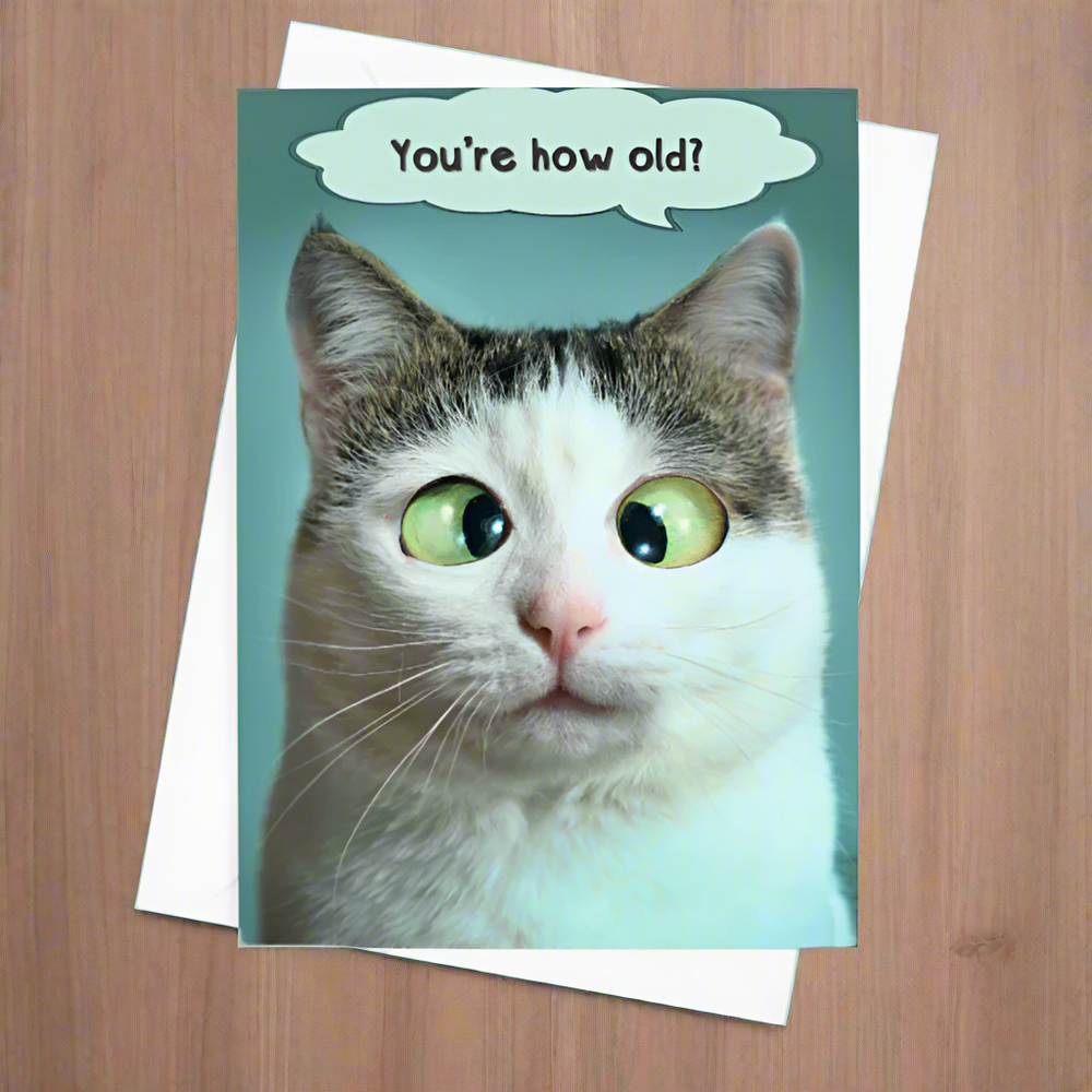 Nothing says "Happy Birthday" quite like a wide-eyed cat judging your age! This hilarious greeting card features an adorable feline with eyes full of shock, disbelief, and maybe just a little bit of concern.